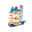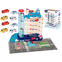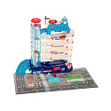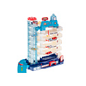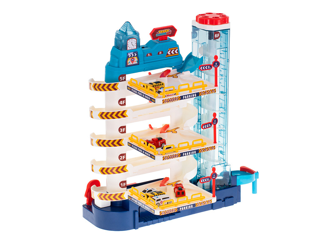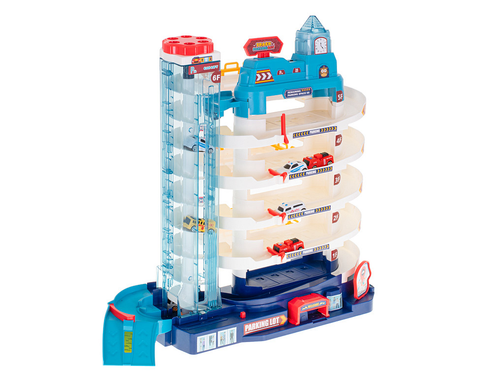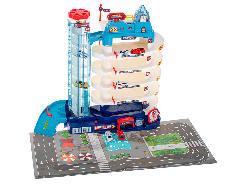 Parking ma aż 5 poziomów, przeznaczonych do parkowania samochodzików, które znajdziesz w zestawie. Na samą górę auta dostaną się za pomocą automatycznej windy.