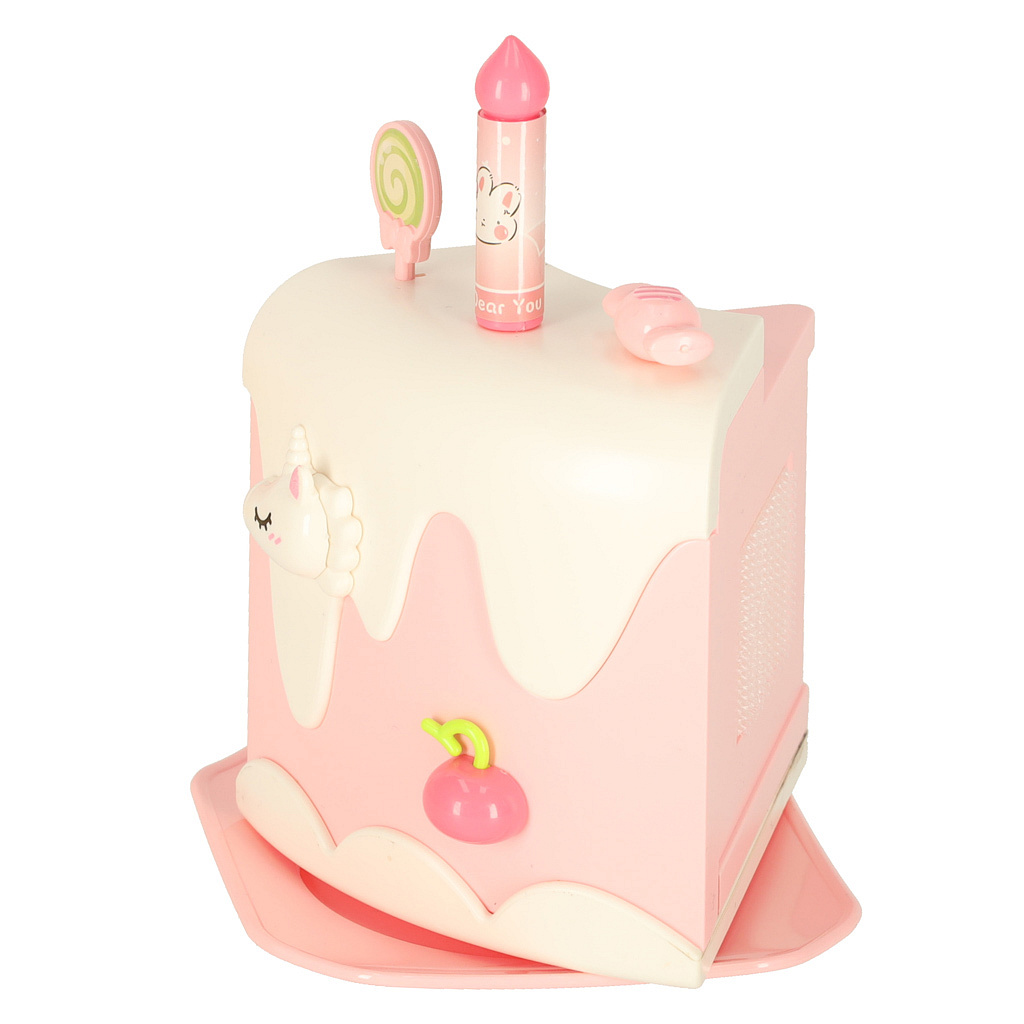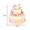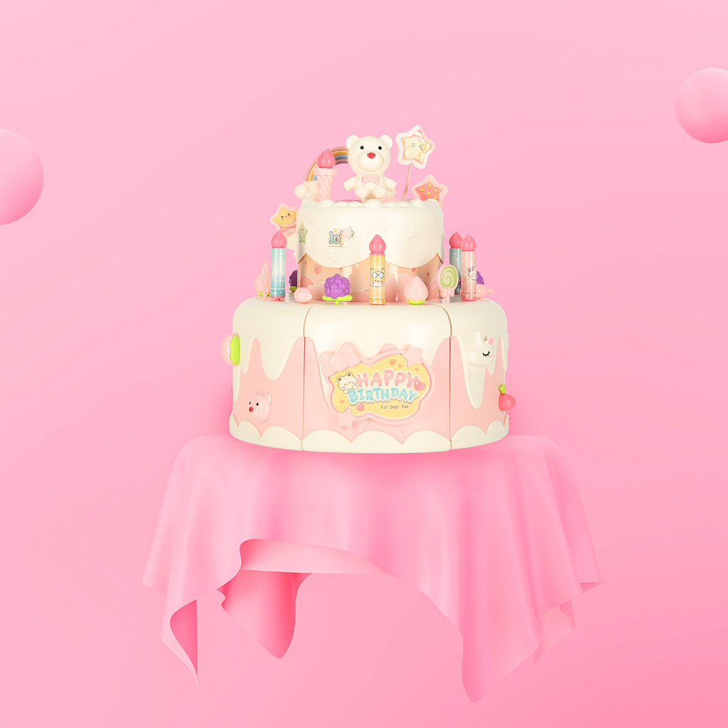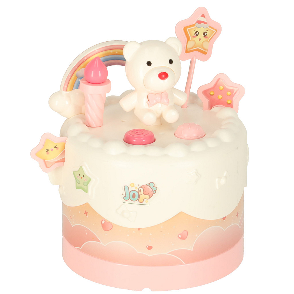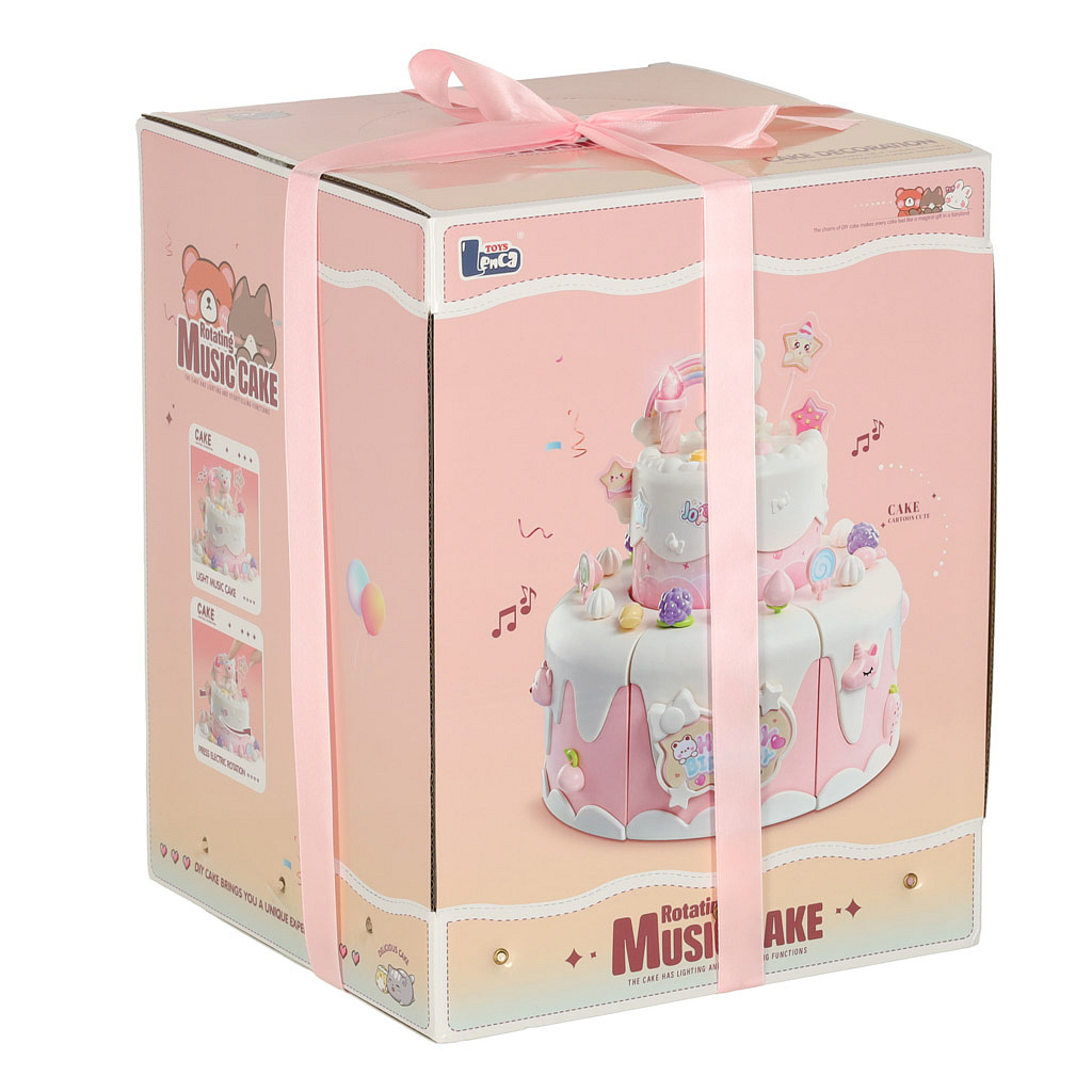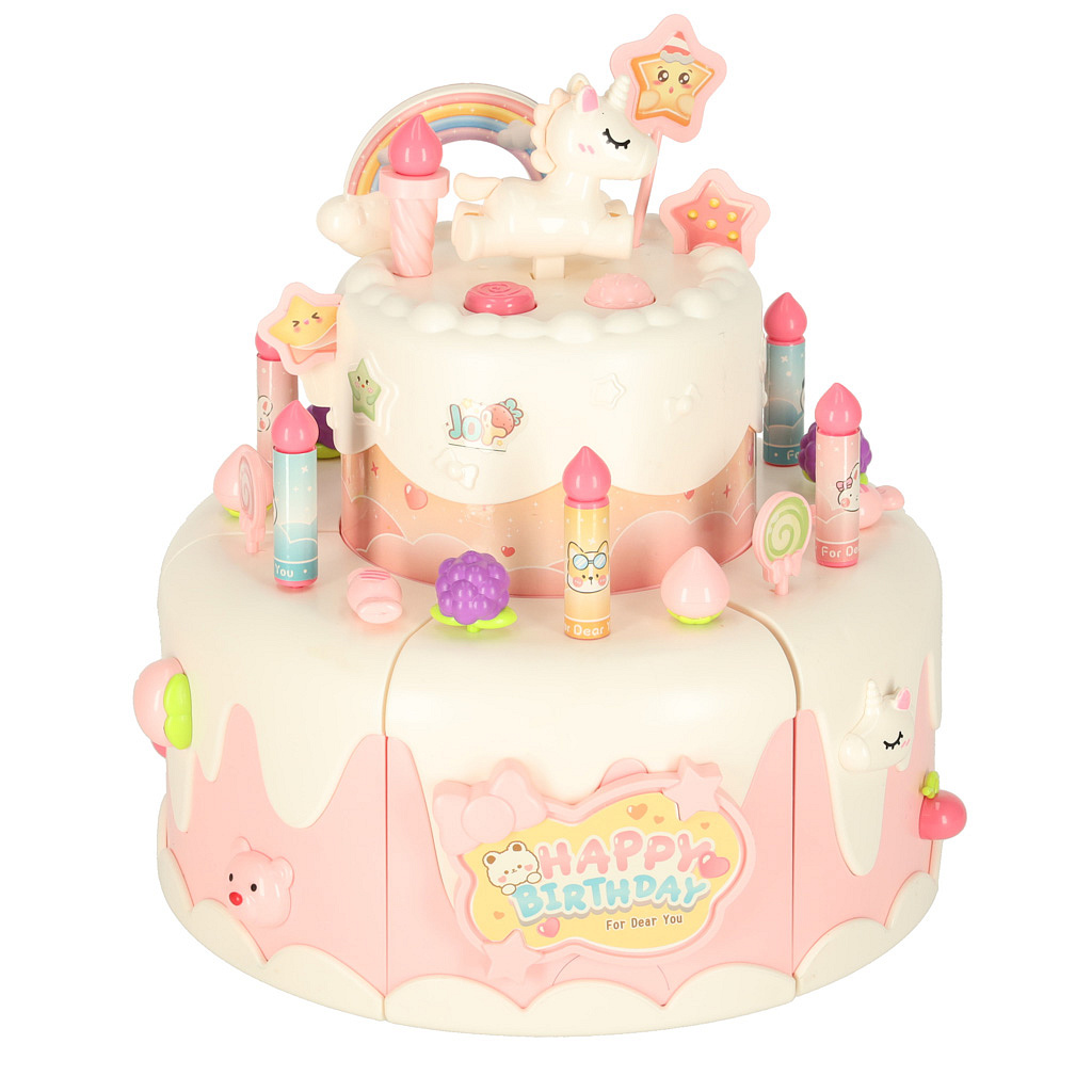 Dvoupatrový hračkový dort můžeš darovat dítěti k narozeninám. Po vložení baterie dort hraje tři veselé melodie. Dort obsahuje také skryté překvapení – po stisknutí figurky medvídka nebo jednorožce se dort otáčí a hraje speciální píseň.