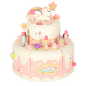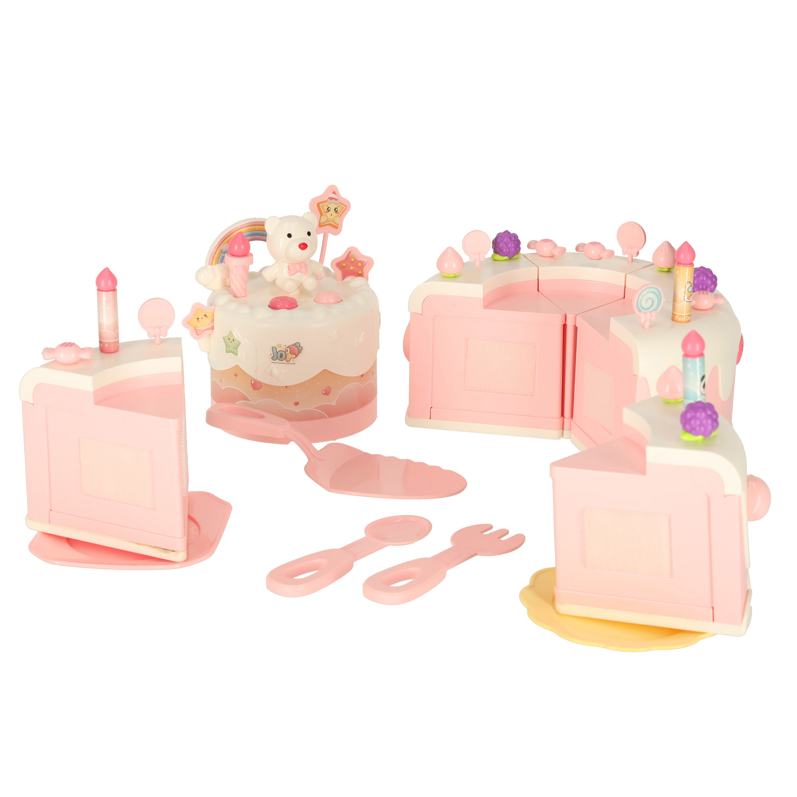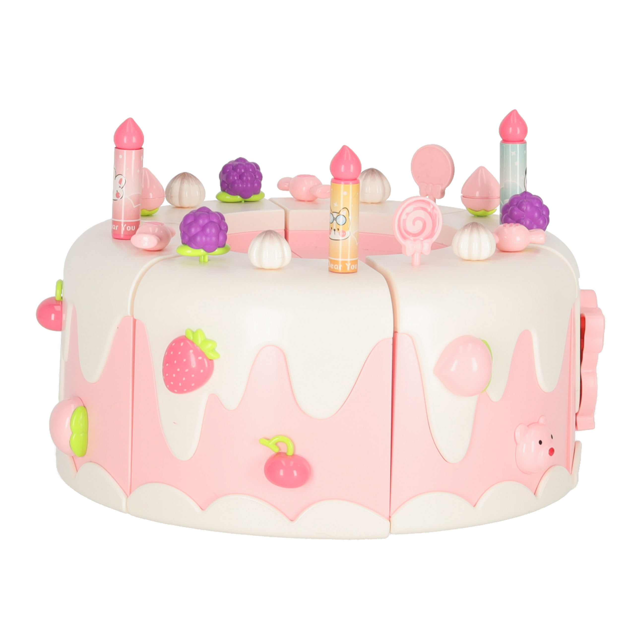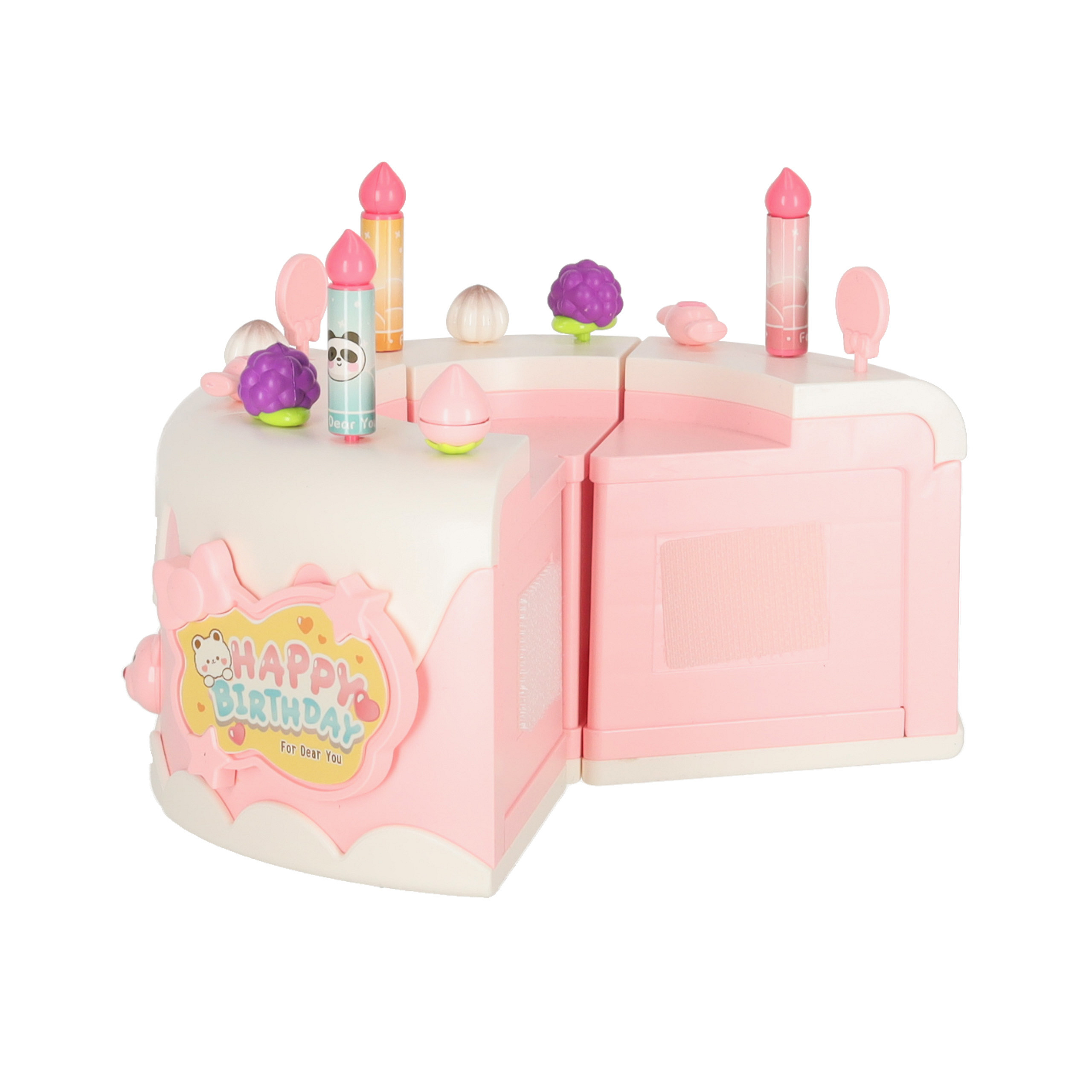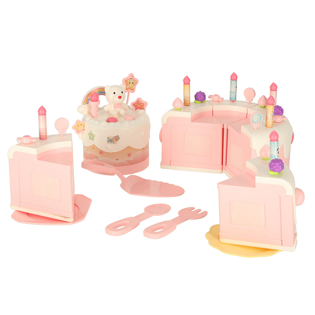 Dvoupatrový hračkový dort můžeš darovat dítěti k narozeninám. Po vložení baterie dort hraje tři veselé melodie. Dort obsahuje také skryté překvapení – po stisknutí figurky medvídka nebo jednorožce se dort otáčí a hraje speciální píseň.