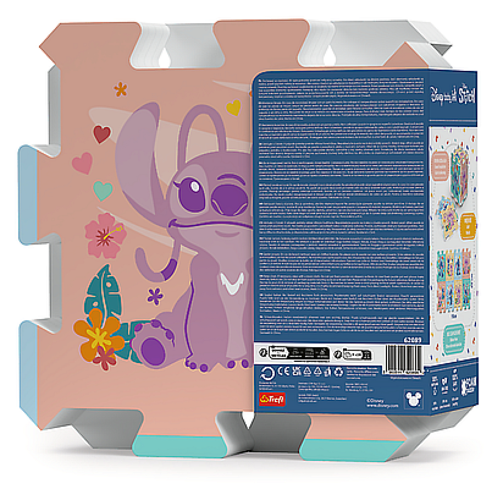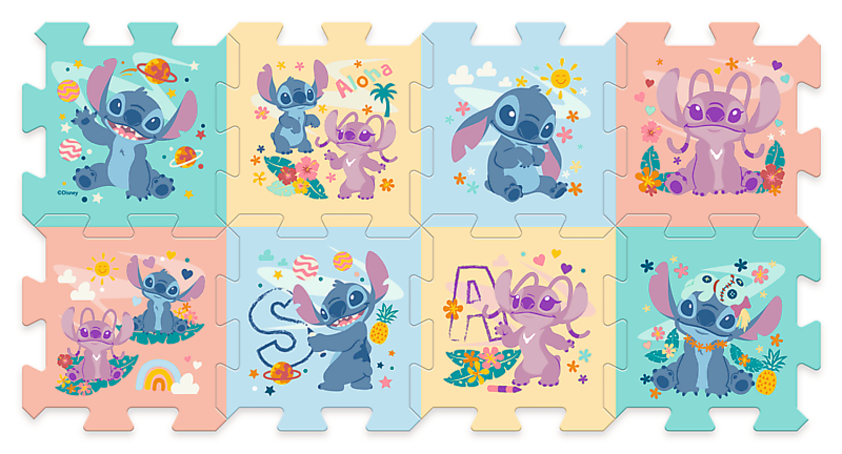 Barevné pěnové puzzle s oblíbenými motivy Lilo & Stitche zpestří každý dětský pokojíček! Měkký, lehký a bezpečný materiál je ideální na hraní, sezení i lezení. Jednotlivé díly se snadno skládají a vytvářejí hrací podložku nebo kostku. Vhodné už od narození. Rozměr jednoho dílu: 32 × 32 × 1 cm Balení: 8 ks v sáčku Vhodné pro děti od 0 měsíců