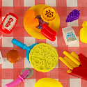 • Sada obsahuje realistické prvky: pizzu, burger, hranolky, ovoce, nápoje a přílohy