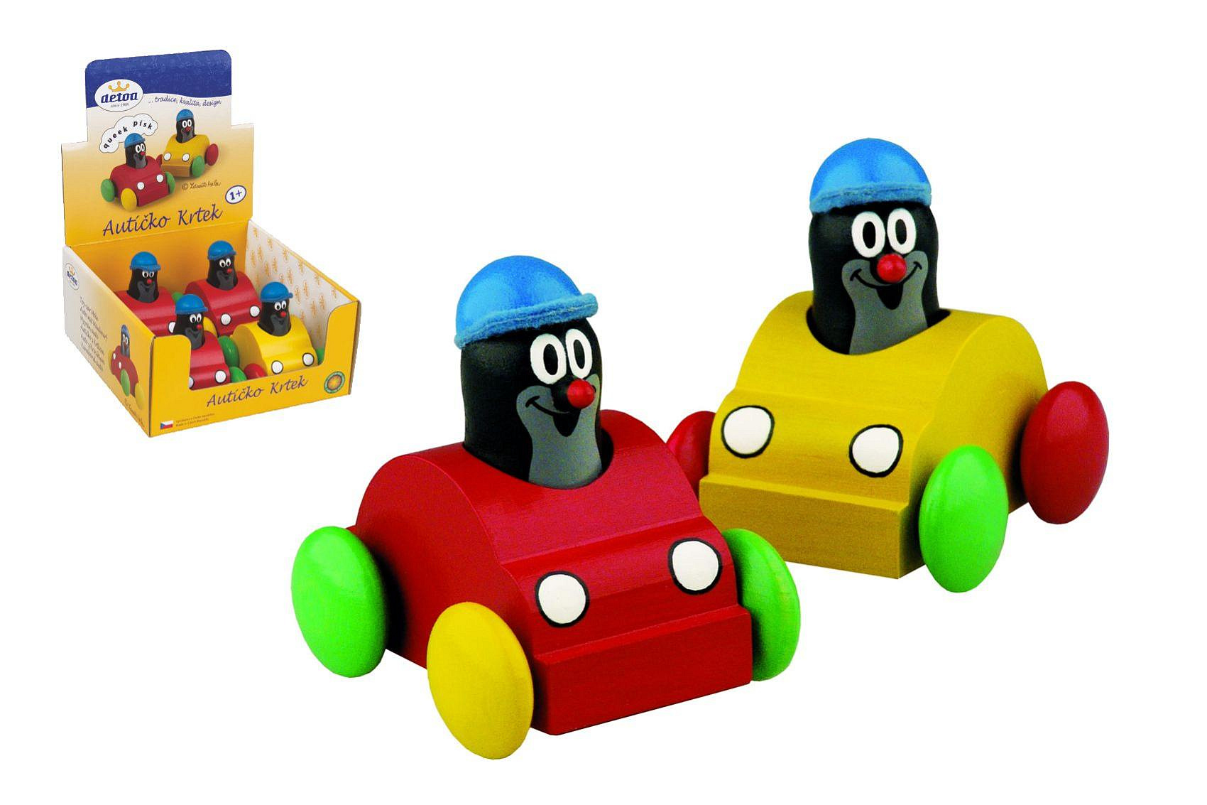 Pískající krtek v autíčku dřevo 7cm 2 barvy 4ks v boxu od 12 měsíců