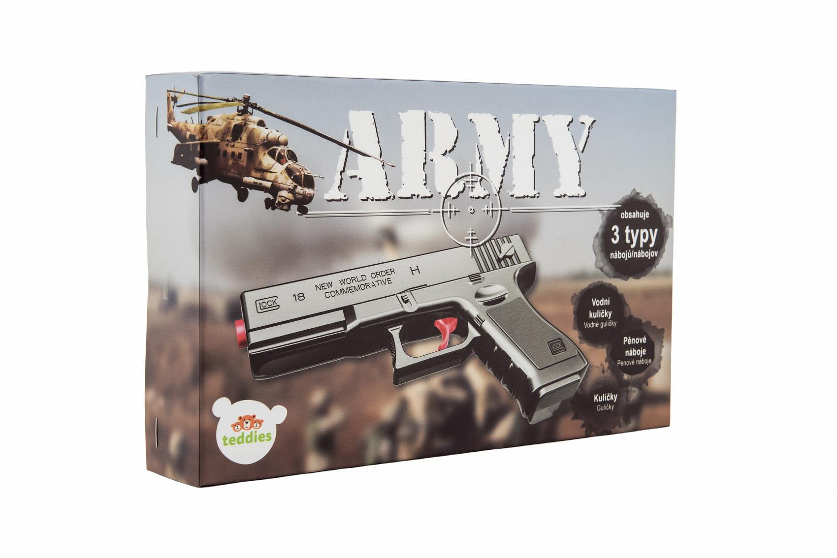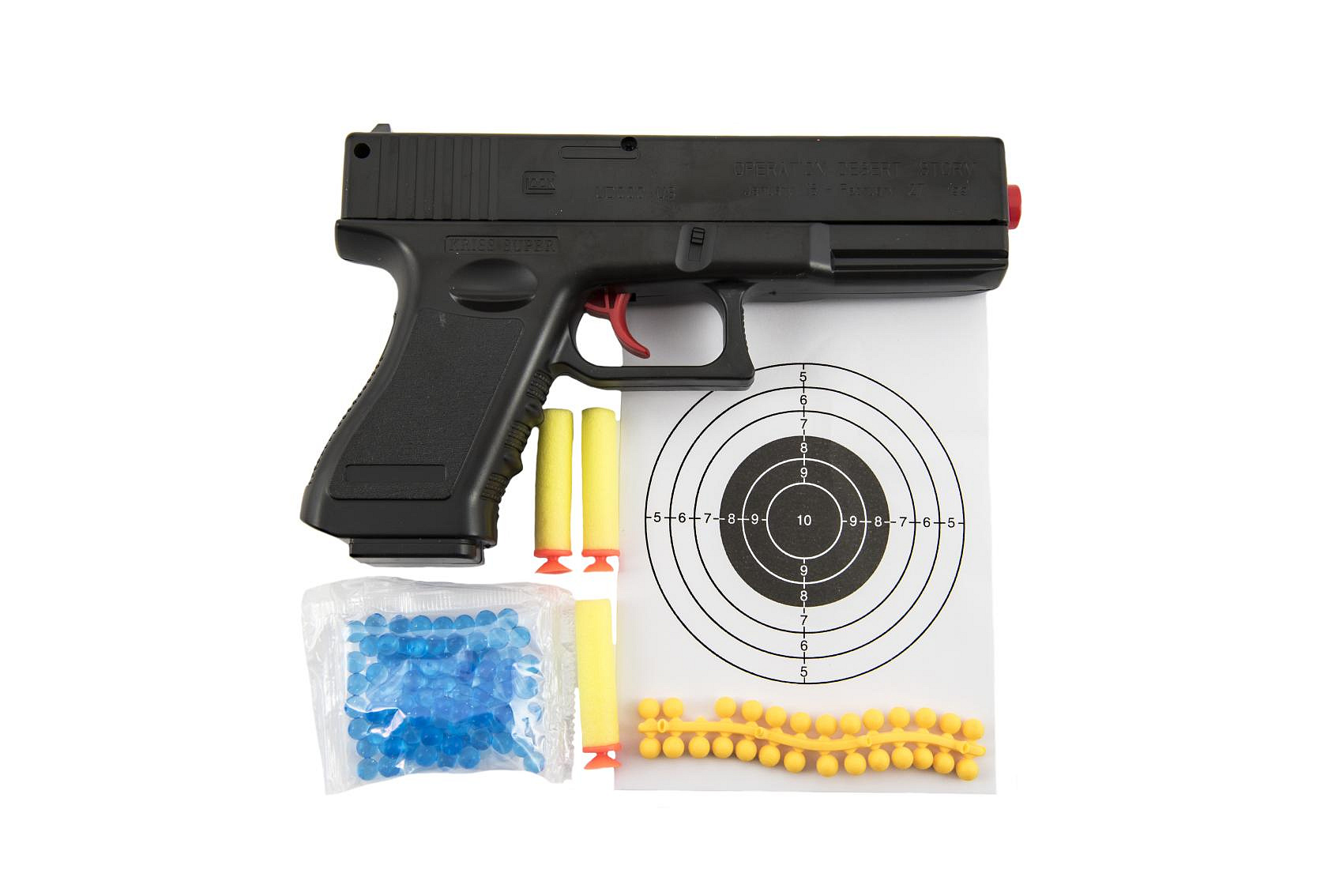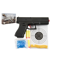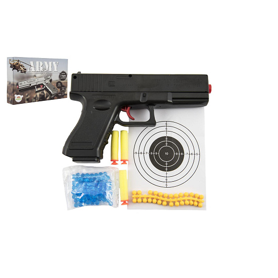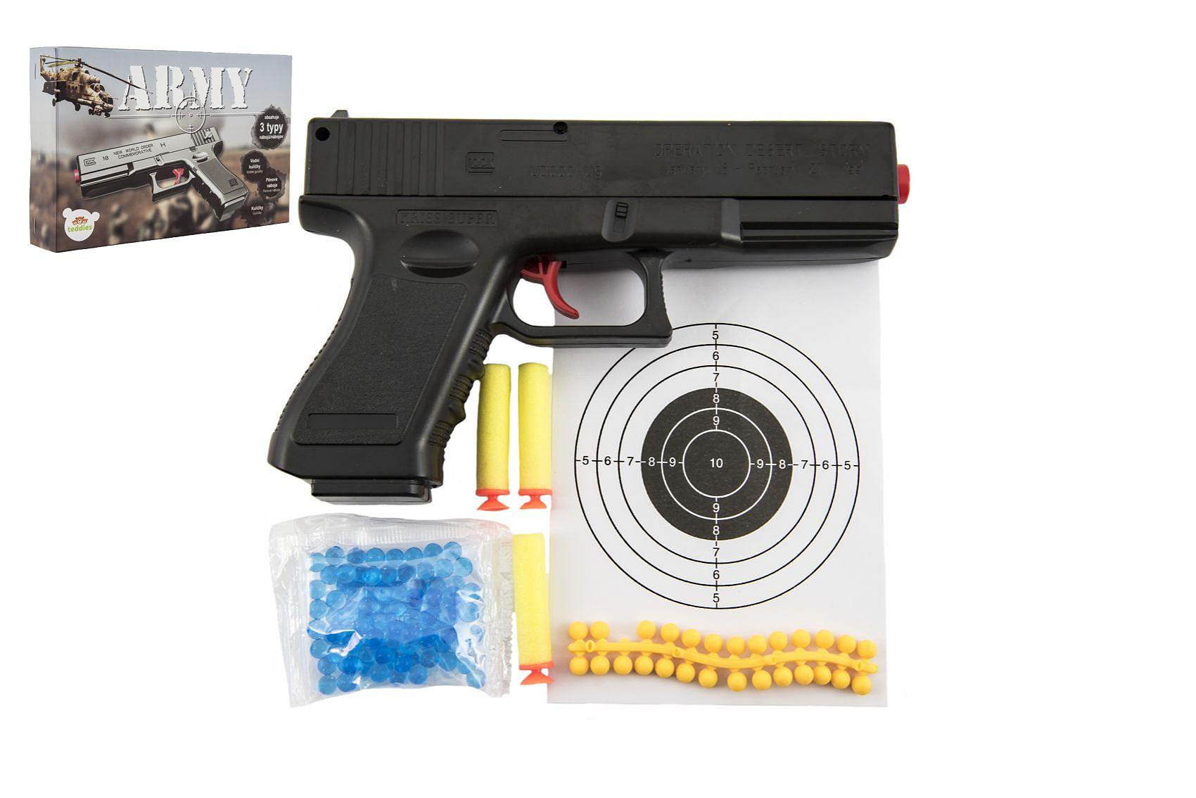 Pistole na kuličky 20cm plast + vodní kuličky 6mm,pěnové náboje 3ks,gumové kul. v krabičce 23x15x4cm
