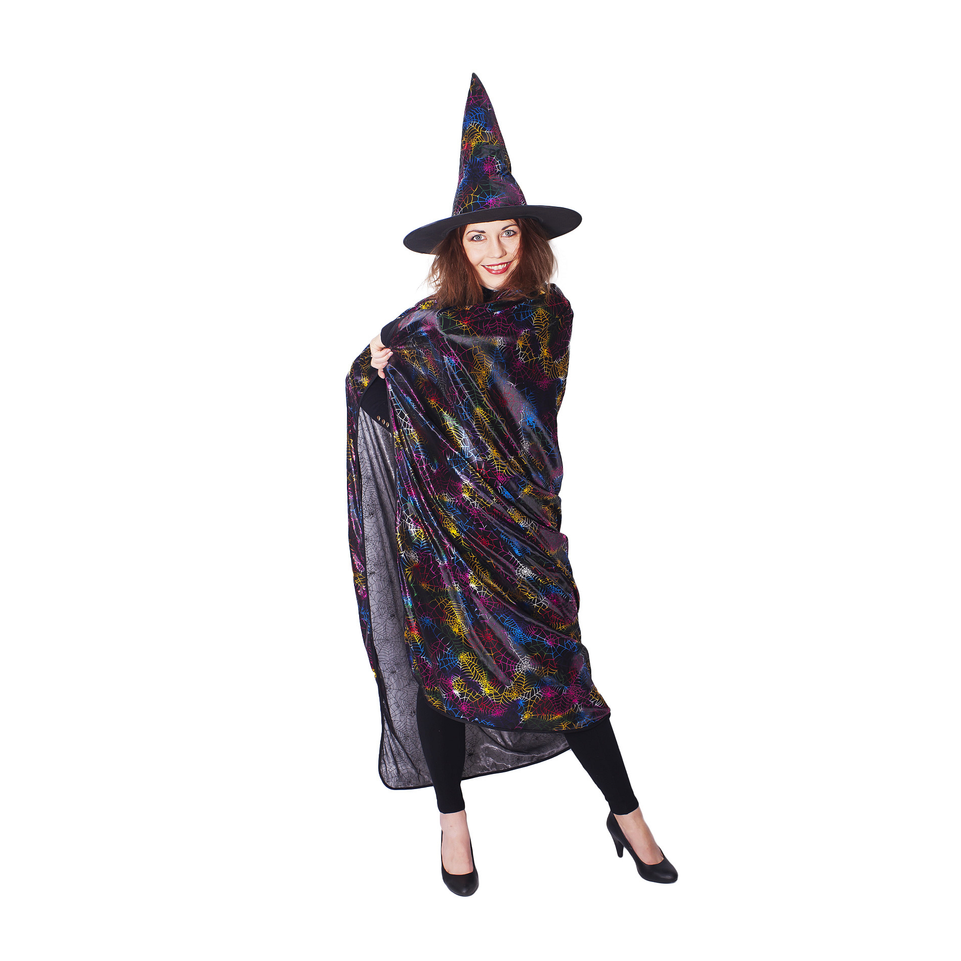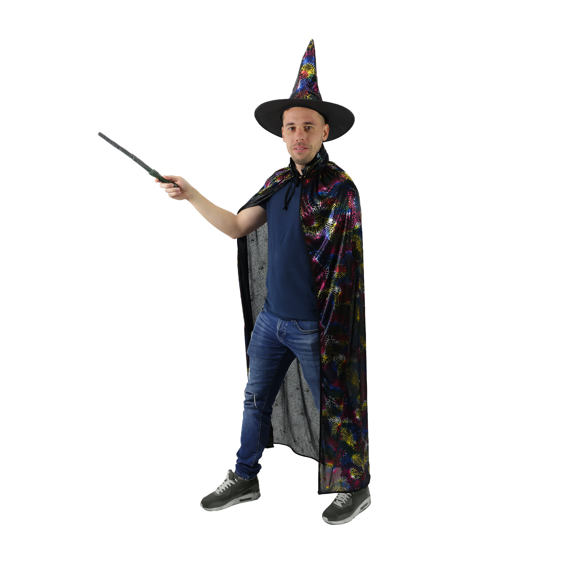 Úžasný černý plášť pro všechny čaroděje a čarodějnice! Plášť je určen pro dospělé a je dekorován potiskem barevných pavučin. Součástí kostýmu je perfektně sladěný klobouk. Plášť je dlouhý cca 140 cm. Ideální na karneval nebo halloweenskou párty. Hůlka není součástí balení.