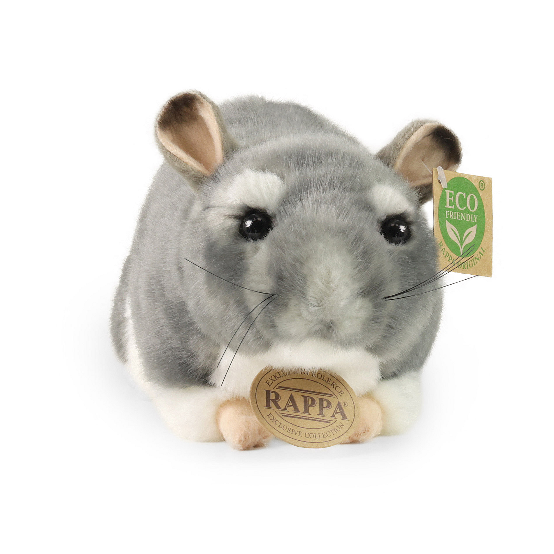 Plyšová činčila měří 21 cm a díky těm nejkvalitnějším materiálům se řadí do Exkluzivní kolekce plyšových hraček značky Rappa. Díky ručnímu zpracování každého kusu navíc vypadá jako živá. Proč označení ECO-FRIENDLY? Rappa si je vědoma všech dopadů na životního prostředí, zaměřuje se na udržitelnost a omezení používání plastů na minimum. Proto je výplň hraček vyrobena z recyklovaných materiálů, zejména PET lahví. Ta je však zcela nezávadná a vhodná i pro děti od narození. FUN FACT: Věděli jste, že činčily mají jednu z nejhustších srstí na světě a z jednoho chlupu jim může vyrůst až asi 50–80 jemných chloupků?