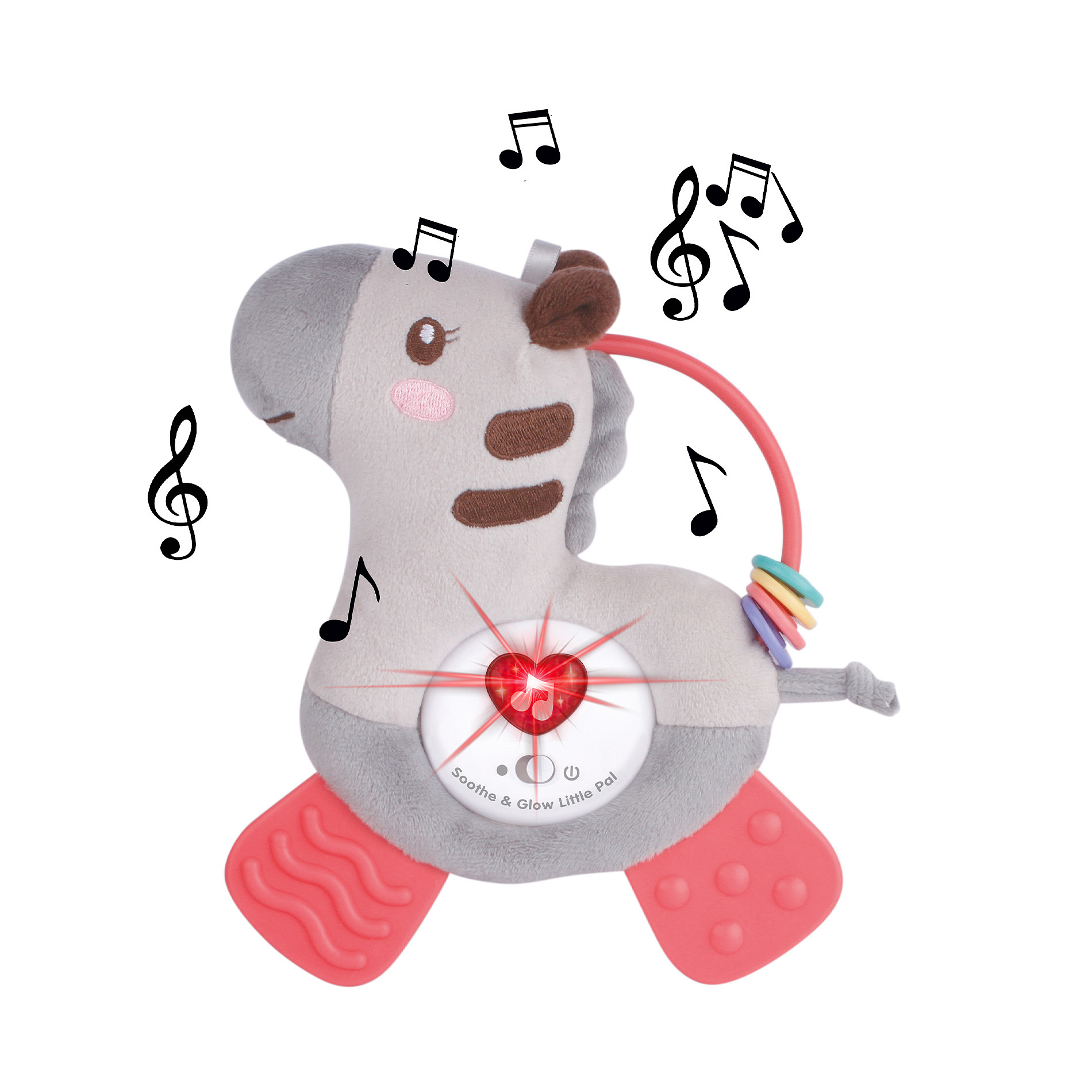 Veselé plyšové kousátko - zebra pro naše nejmenší děti. Při stisknutí barevně bliká a vydává zvuky. Hračka rozvíjí smyslové vnímání dítěte a podněcuje jeho fantazii. Hračka funguje na 3 baterie typu AG13, které jsou součástí výrobku. Přiložen i praktický klip na uchycení do kočárku.