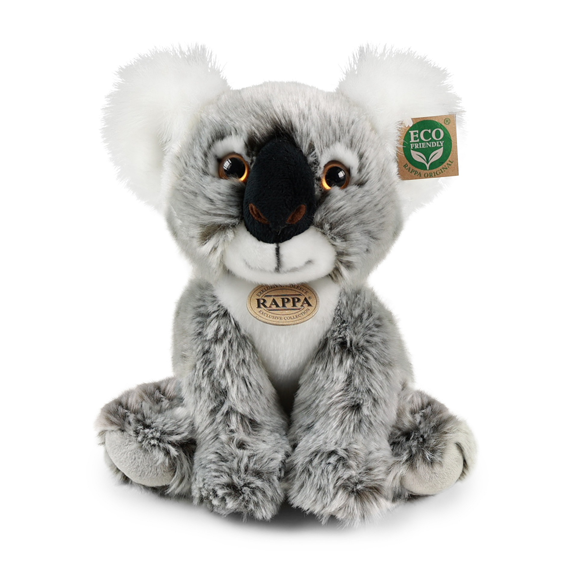 Plyšový medvídek koala je ručně ušitý z vysoce kvalitní, jemné plyše, a díky tomu vypadá jako živý. Tento sedící koala měří 26 cm. Pro svou roztomilost se stává vítaným společníkem nejen do každého dětského pokojíčku. Je součástí exkluzivní kolekce plyšových hraček RAPPA. Rozhodli jsme se jít zelenou cestou co nejméně zatěžující životní prostředí - cestou ECO-FRIENDLY. Co to vlastně ECO-FRIENDLY znamená? Výplň plyšové hračky je vyrobena z recyklovaných PET lahví. Tento materiál je zcela bezpečný, na omak nerozeznatelný od standardní výplně a plně atestovaný pro bezpečnost i těch nejmenších.
