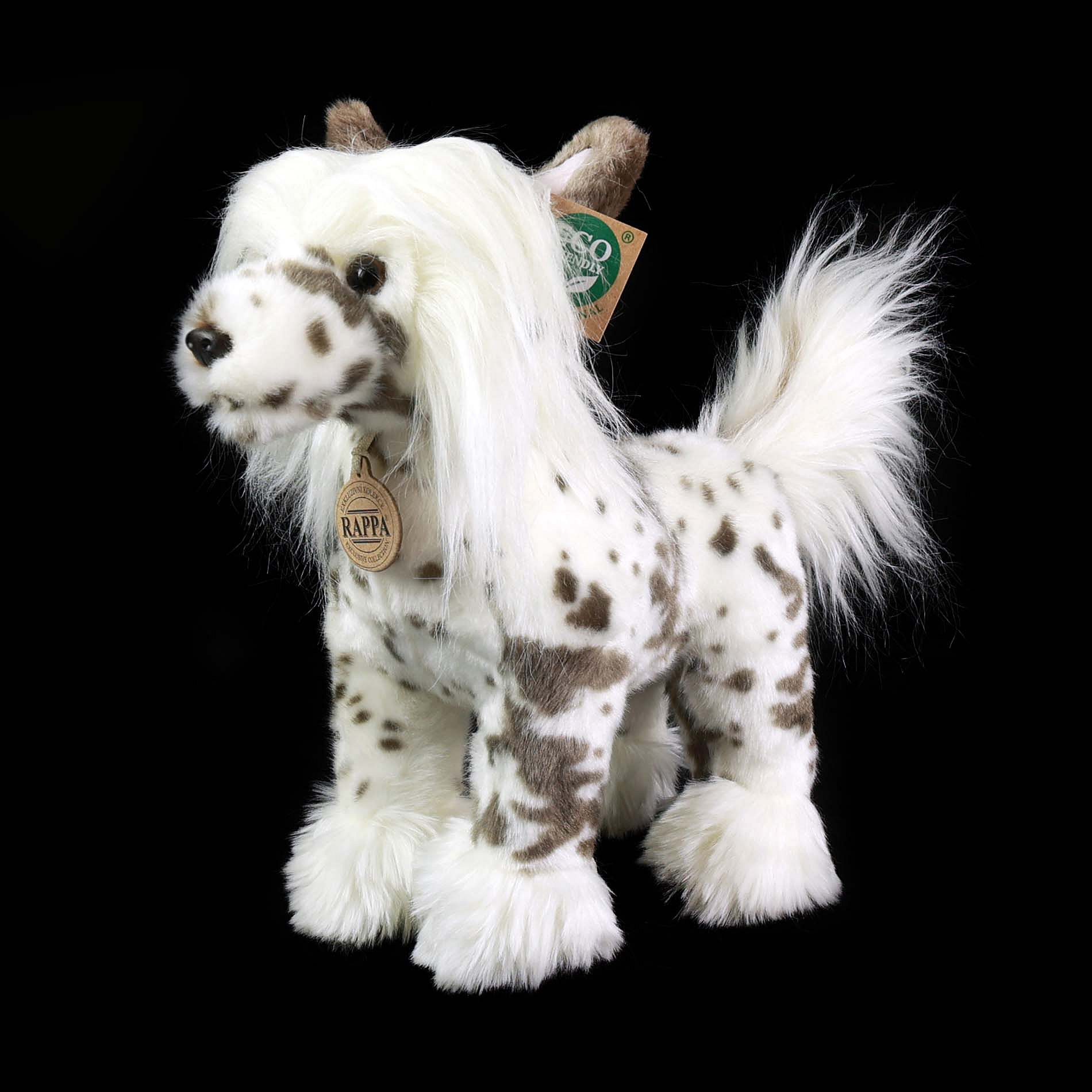 Plyšový pes rasy čínský chocholatý 25 cm a díky těm nejkvalitnějším materiálům se řadí do Exkluzivní kolekce plyšových hraček značky Rappa. Díky ručnímu zpracování každého kusu navíc vypadá jako živý. Proč označení ECO-FRIENDLY? Rappa si je vědoma všech dopadů na životního prostředí, zaměřuje se na udržitelnost a omezení používání plastů na minimum. Proto je výplň hraček vyrobena z recyklovaných materiálů, zejména PET lahví. Ta je však zcela nezávadná a vhodná i pro děti od narození. FUN FACT: Věděli jste, že čínští chocholatí psi jsou známí tím, že mohou být i zcela bezsrstí, kromě chlupů na hlavě, tlapkách a ocasu?