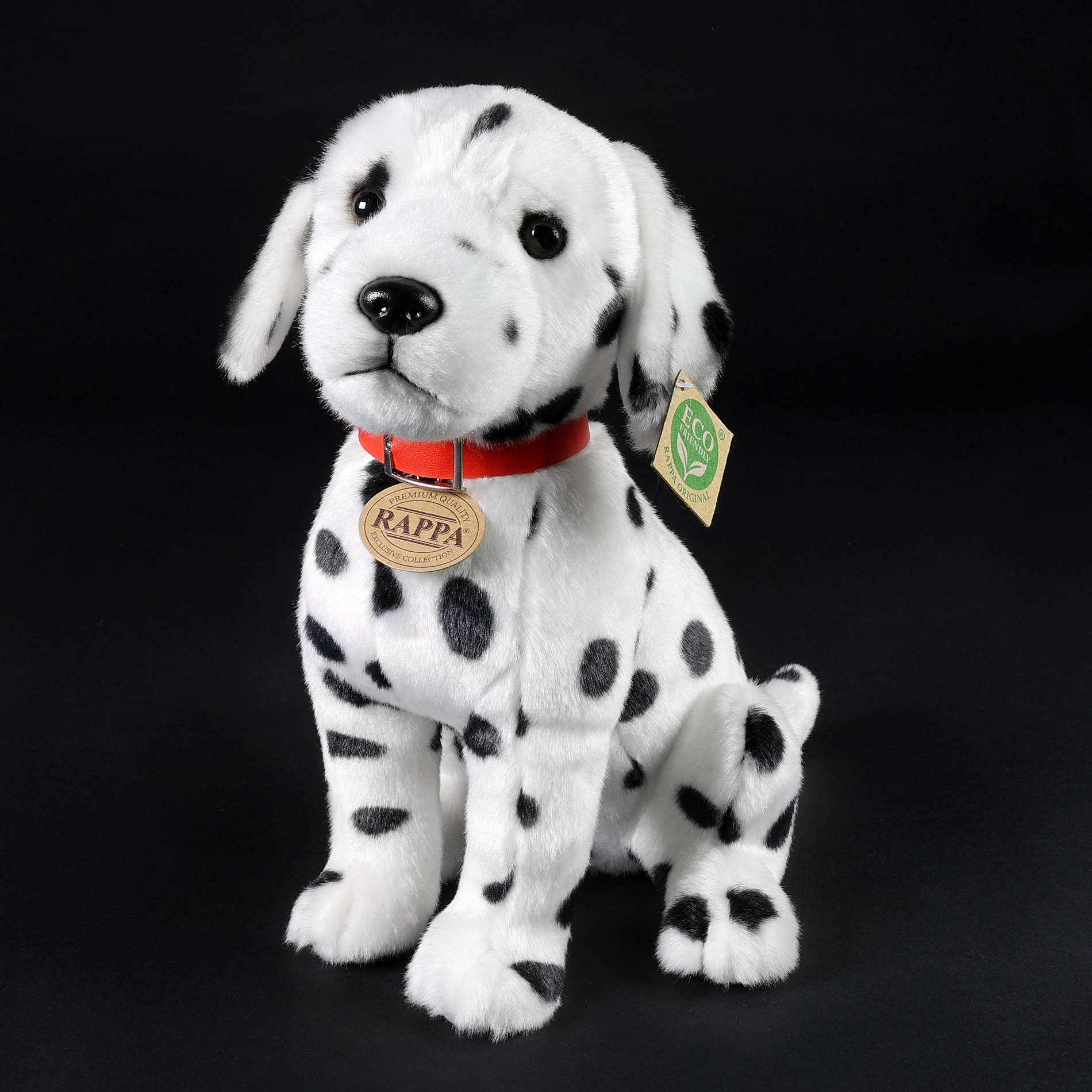 Plyšový pes rasy dalmatin měří 30 cm a díky těm nejkvalitnějším materiálům se řadí do Exkluzivní kolekce plyšových hraček značky Rappa. Díky ručnímu zpracování každého kusu navíc vypadá jako živý. Proč označení ECO-FRIENDLY? Rappa si je vědoma všech dopadů na životního prostředí, zaměřuje se na udržitelnost a omezení používání plastů na minimum. Proto je výplň hraček vyrobena z recyklovaných materiálů, zejména PET lahví. Ta je však zcela nezávadná a vhodná i pro děti od narození. FUN FACT: Věděli jste, že dalmatini se rodí úplně bílí a jejich typické černé nebo hnědé tečky se objevují až později?