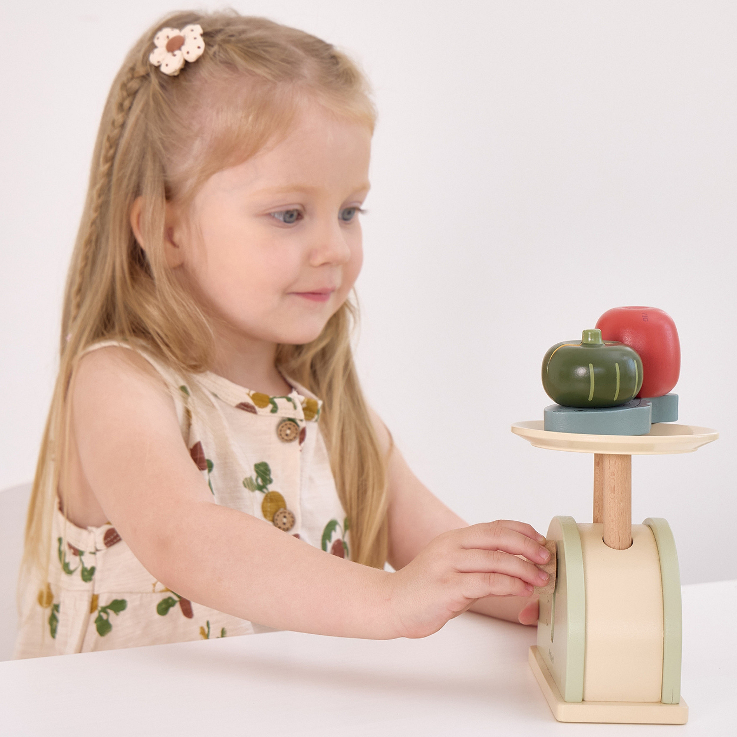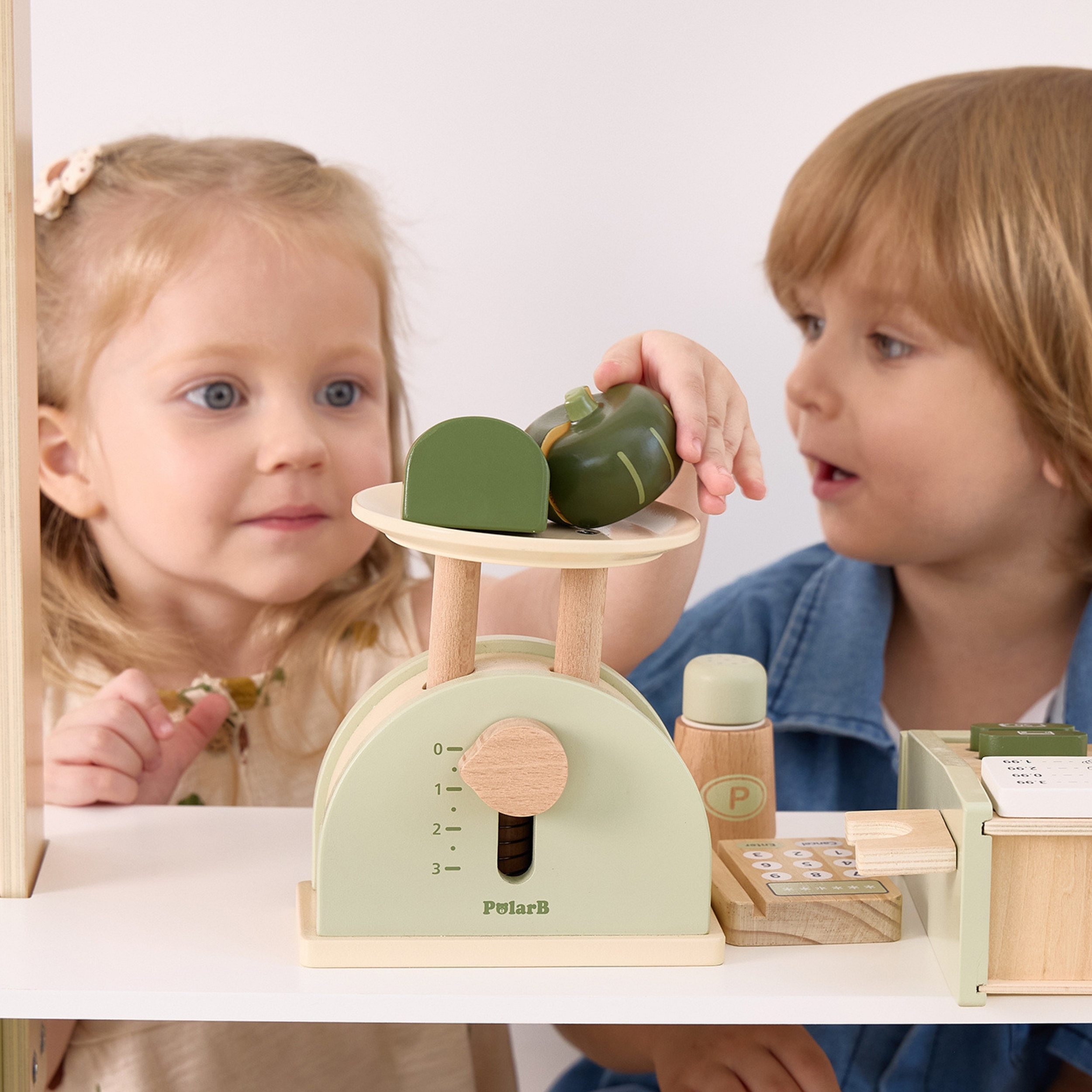 PolarB Drewniana Waga Kuchenna to doskonała zabawka edukacyjna dla najmłodszych, która wprowadza dzieci w świat pojęć związanych z wagą i liczbami. Dzięki ruchomej dźwigni, dziecko może obserwować, jak balansuje różne przedmioty, co rozwija zrozumienie podstawowych zasad fizyki. Drewniana waga to idealny towarzysz zabaw w straganie czy kuchni,