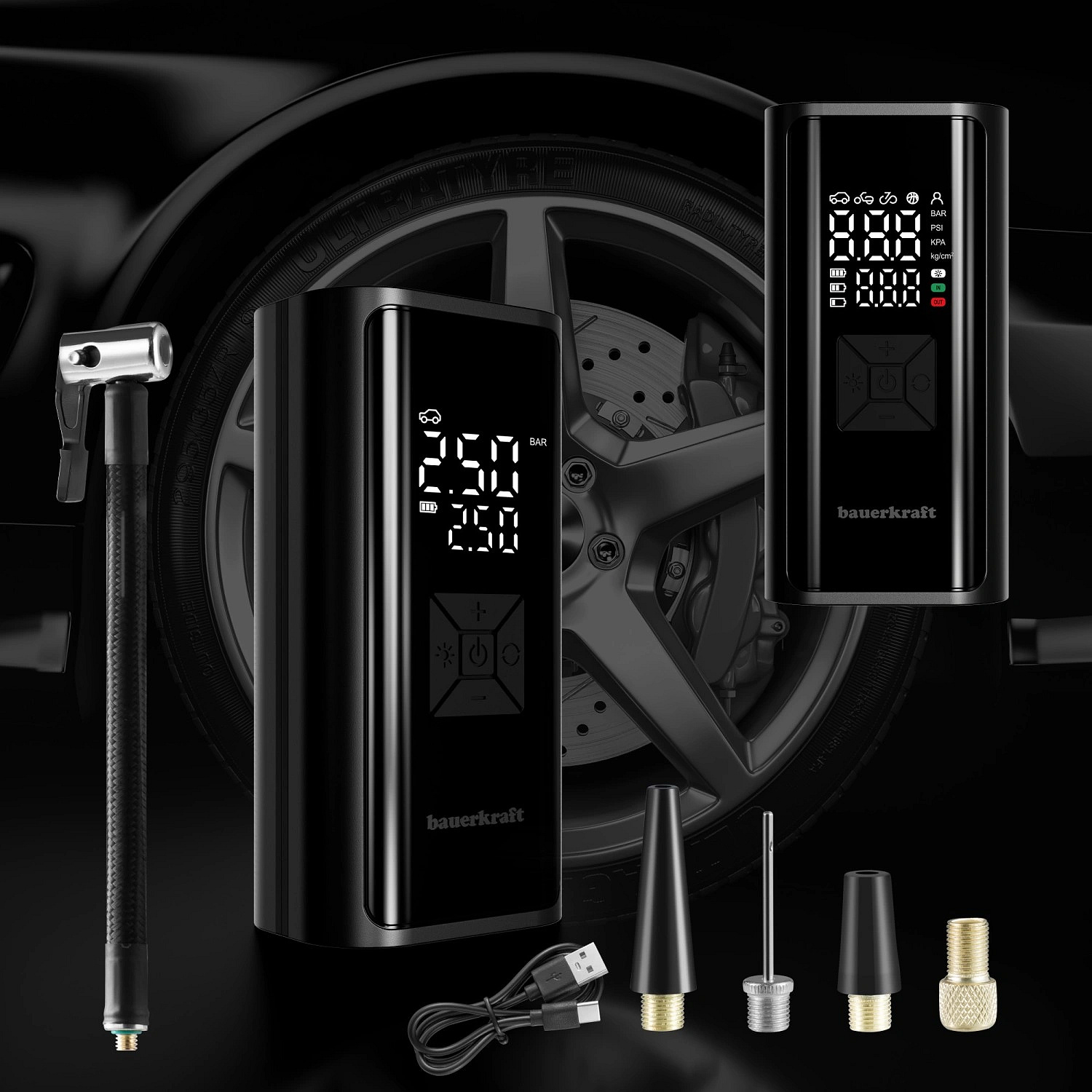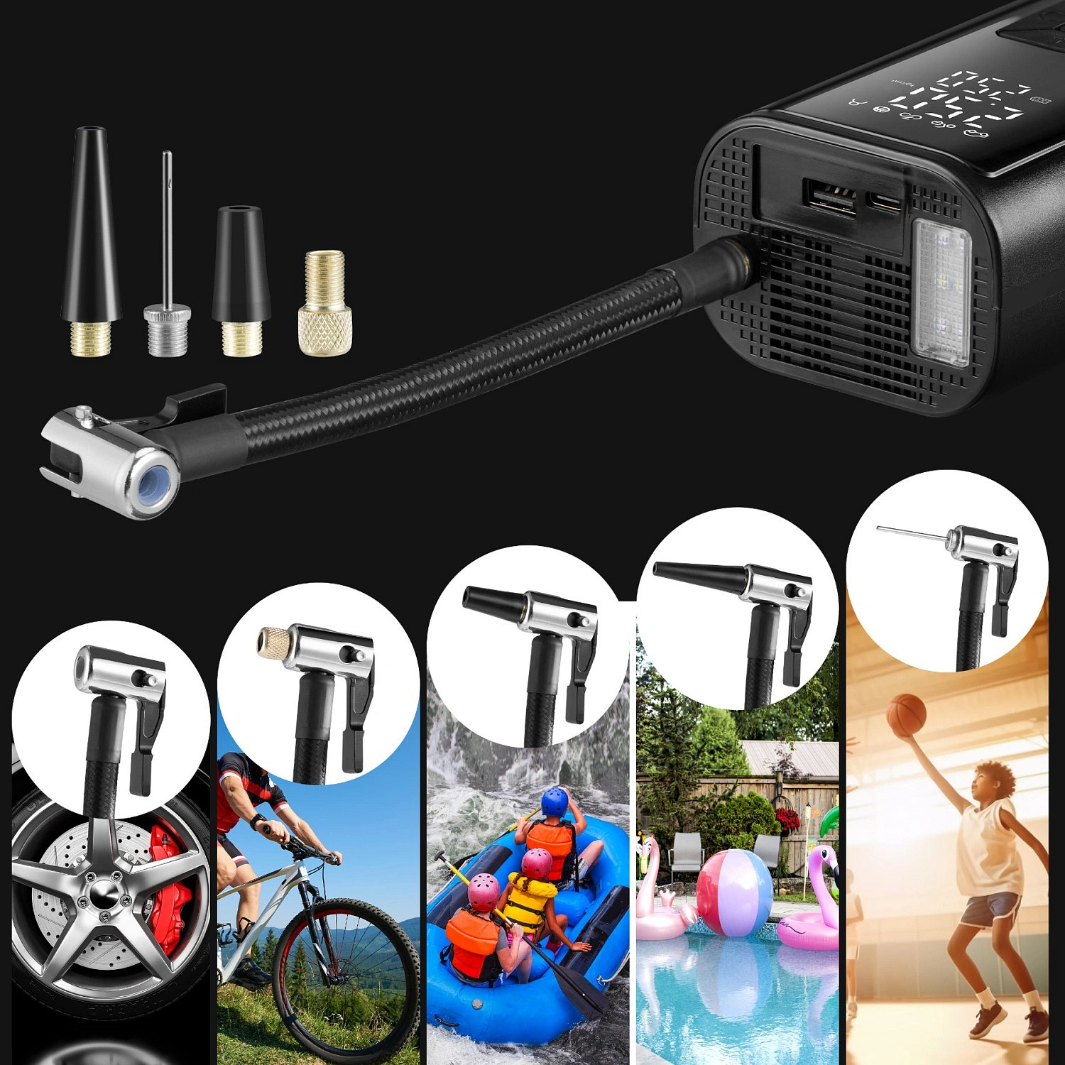 The electric air pump is a practical device that works well in many everyday situations – from quickly inflating a bicycle tire before a ride to emergency use during a car trip. Thanks to its compact design, it can be easily carried in a backpack, bike bag, or car compartment. The cordless design ensures full mobility, while the built-in battery allows use almost anywhere. Additionally, the power bank function enables emergency phone charging, which can be especially useful during long journeys or trips.