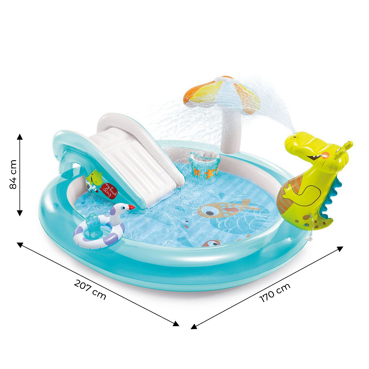 The set includes inflatable accessories such as a duck and a fisherman’s bucket, making every moment in the water more enjoyable. The inflatable ring can be used for throwing games.