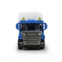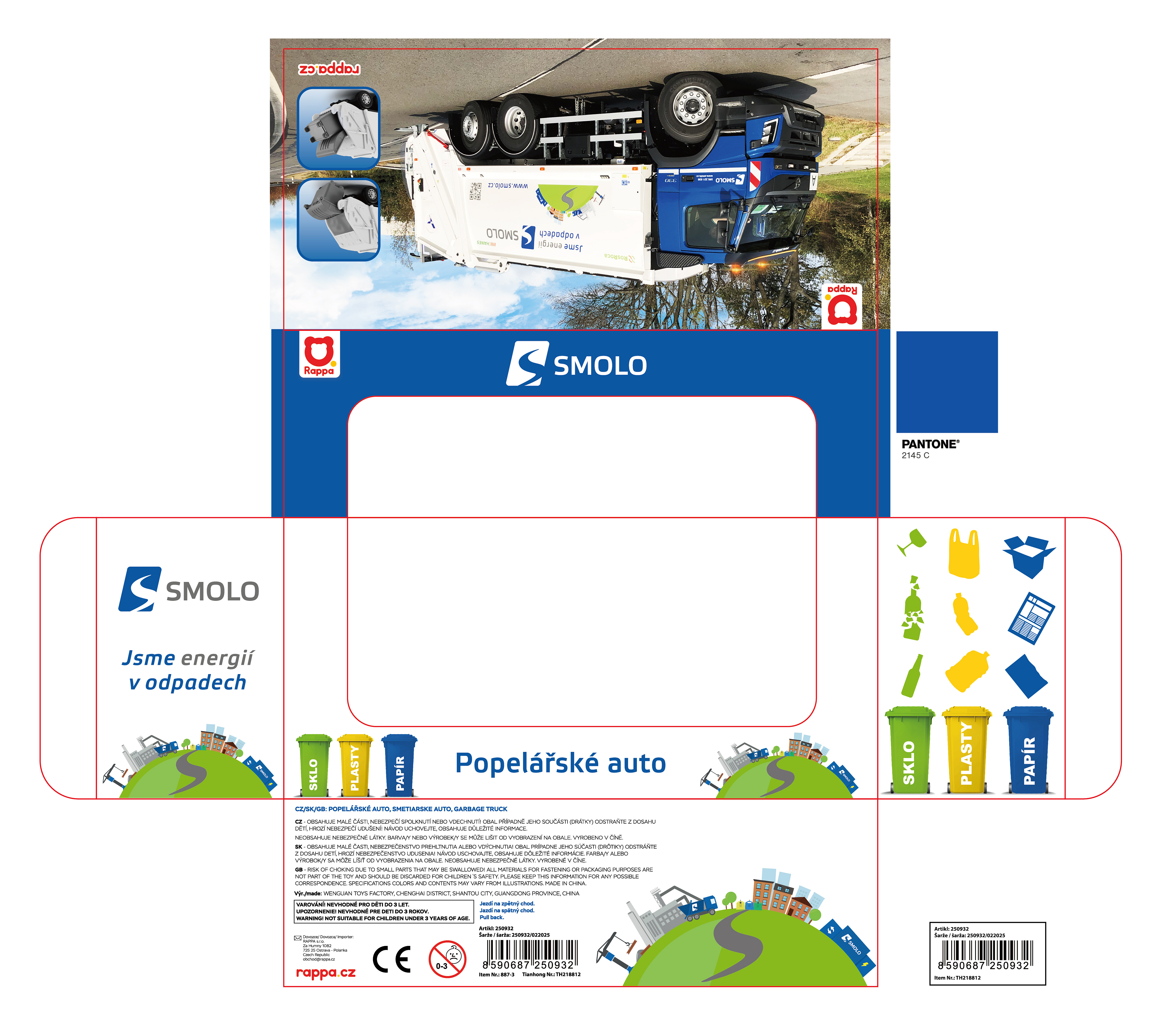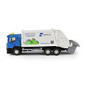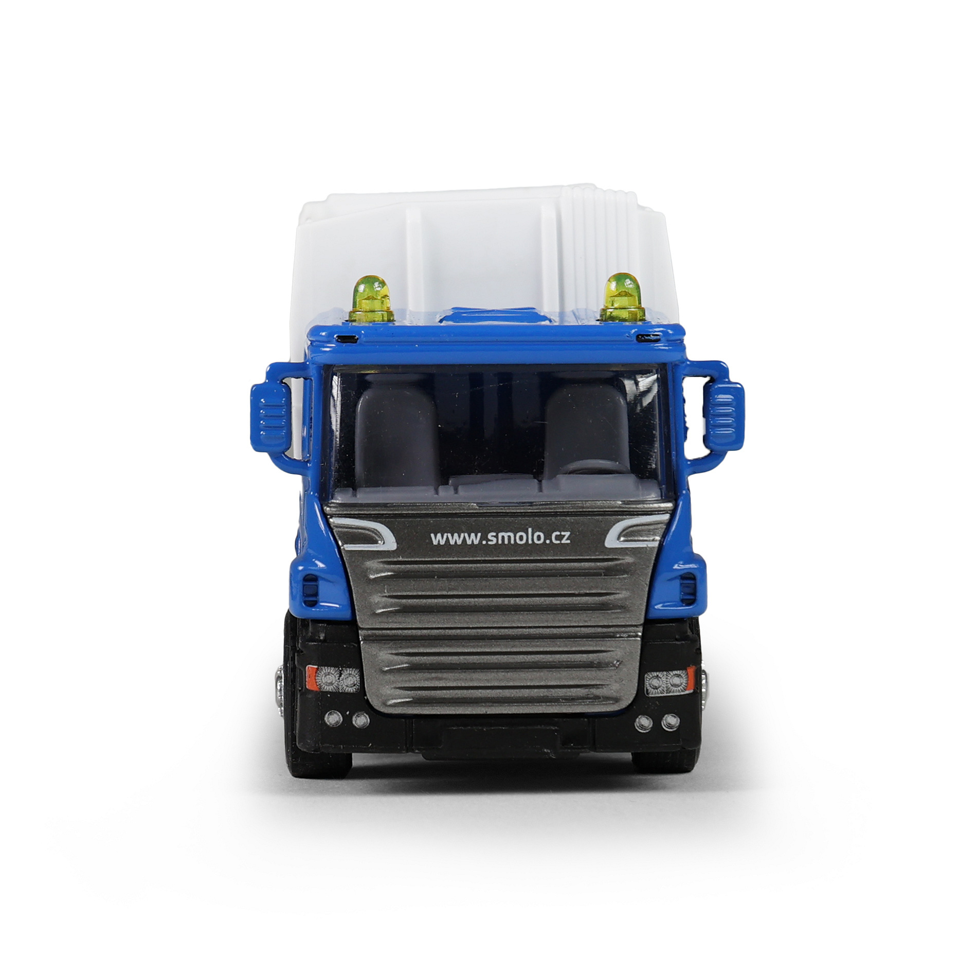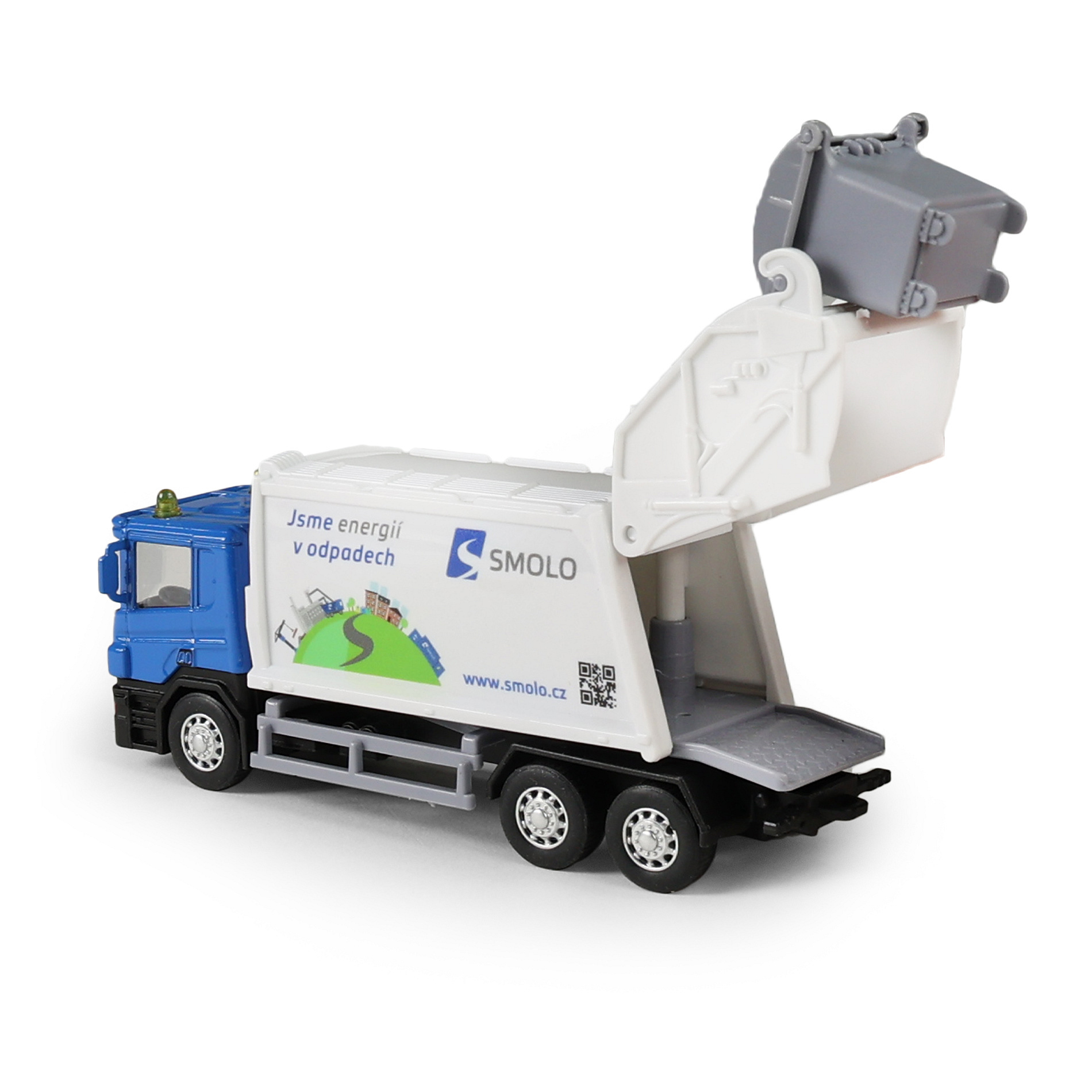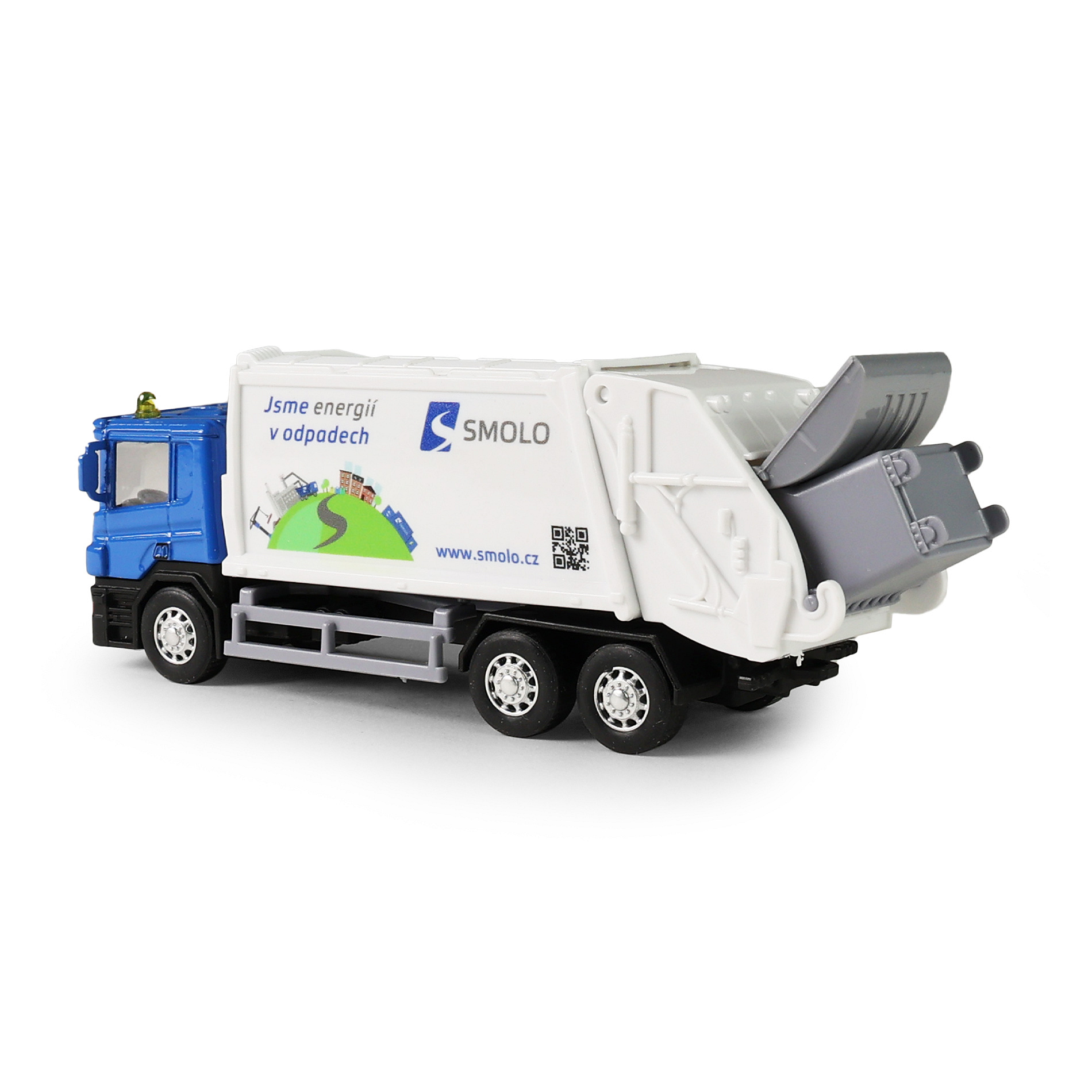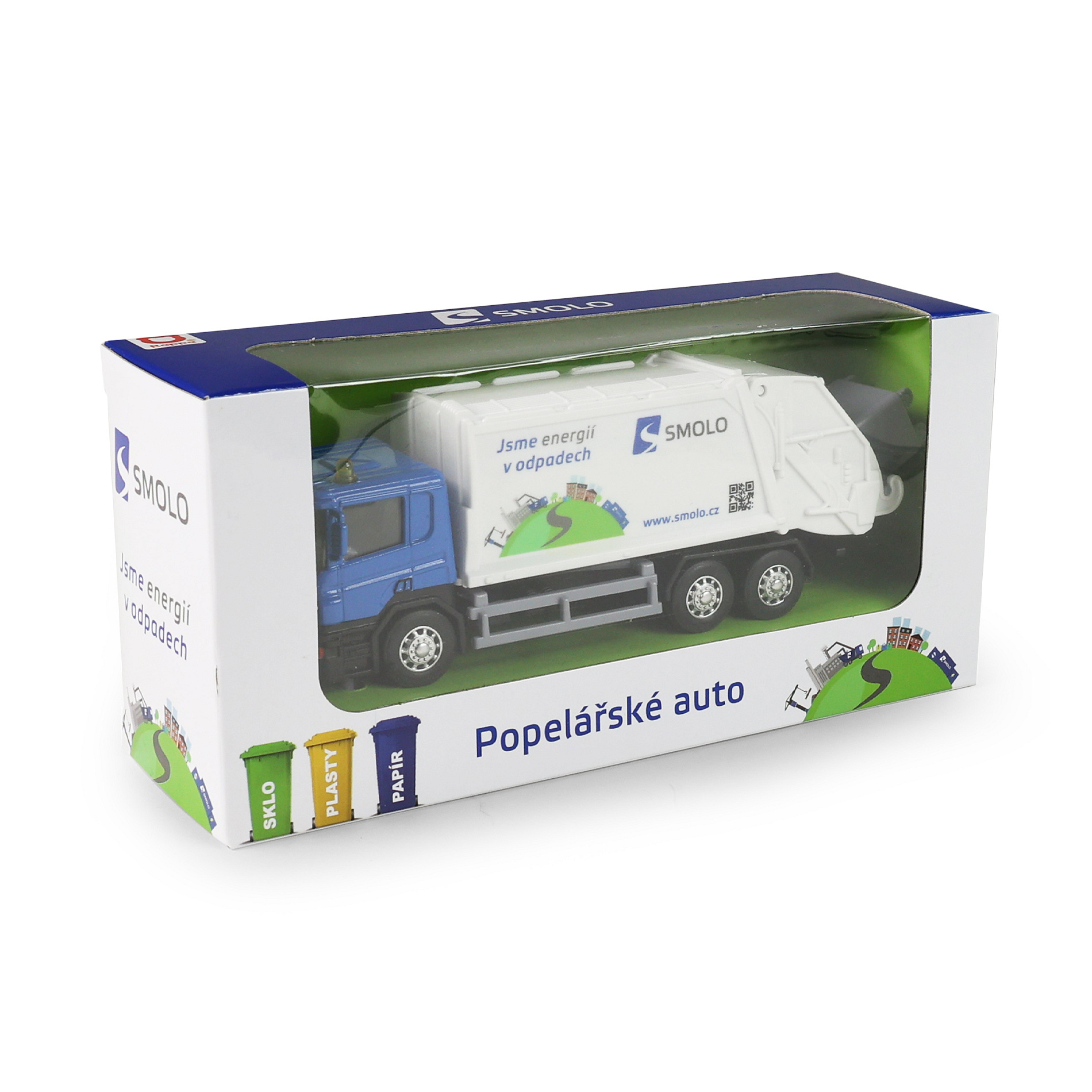 Kovové popelářské auto s plastovou korbou a logem SMOLO. Korba má v zadní části odklápěcí dveře, součástí je otevírací popelnice. Auto jezdí na zpětný chod a jeho délka je 15 cm.