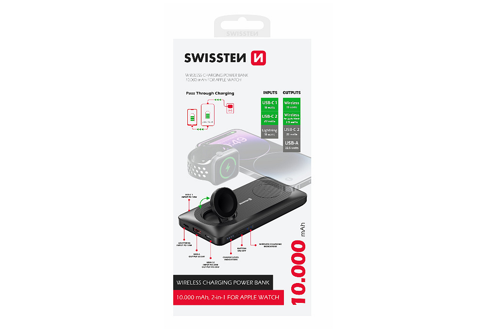 Powerbanka disponuje dvěma bezdrátovými výstupy. Jeden je určen pro chytré hodinky Apple Watch s výstupním výkonem 2,5W a druhý pro smartphony s výstupním výkonem až 15W.