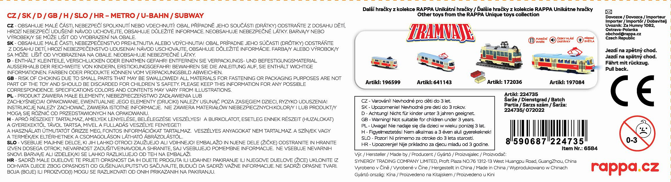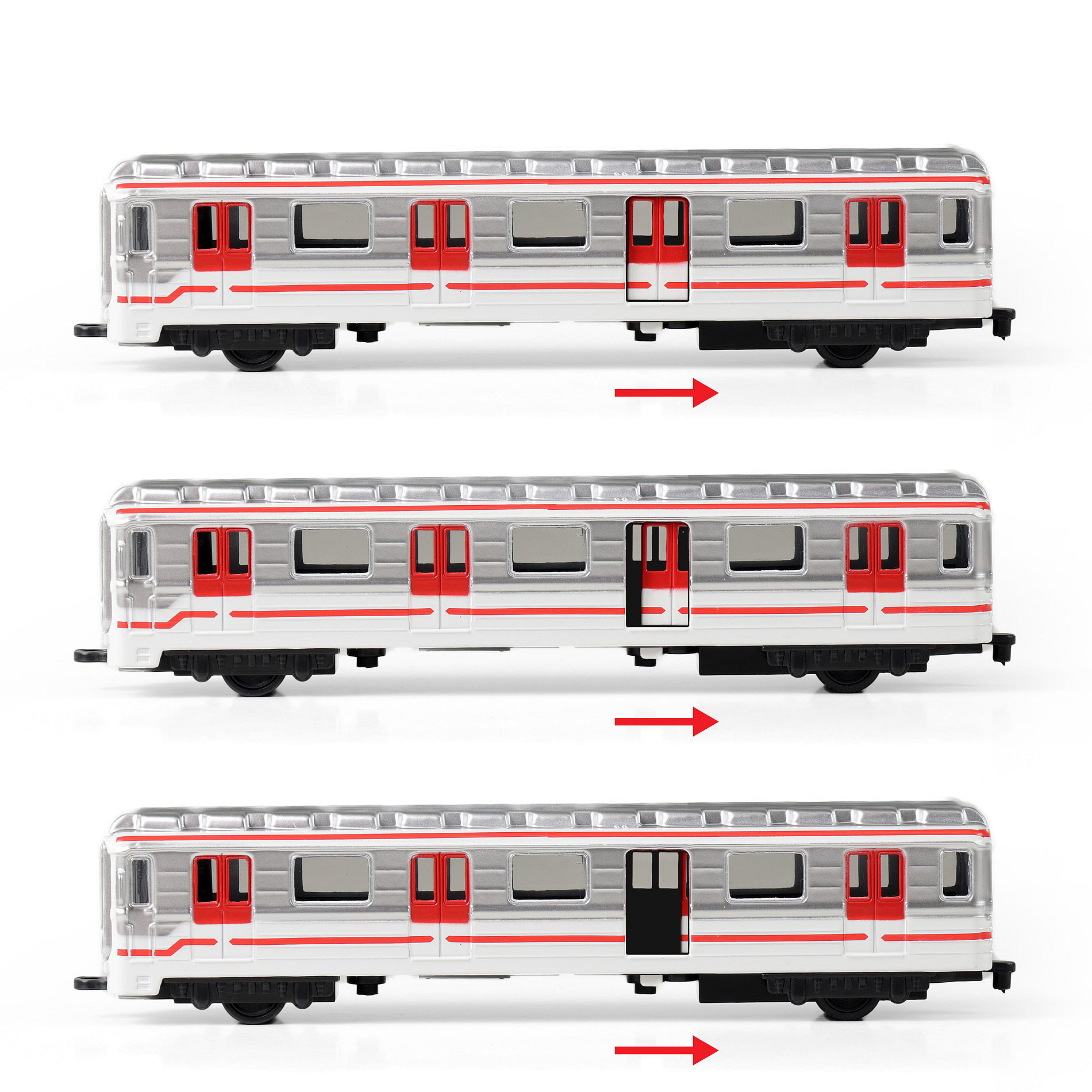 Originální hračka vytvořená ve spolupráci s hlavním městem Praha a Dopravním podnikem hlavního města Prahy. Délka metra je 16 cm. Tento jedinečný kousek v měřítku 1:110 se určitě stane oblíbenou hračkou všech malých nadšenců městské hromadné dopravy nejen v Praze. Navíc lze jednotlivé soupravy jednoduše zapojit za sebou. Jedny dveře metra je možné otevřít, pomocí páčky ve spodní části vozu. Jezdí na zpětný chod. Metro má rozchod kol cca 1,5 cm.