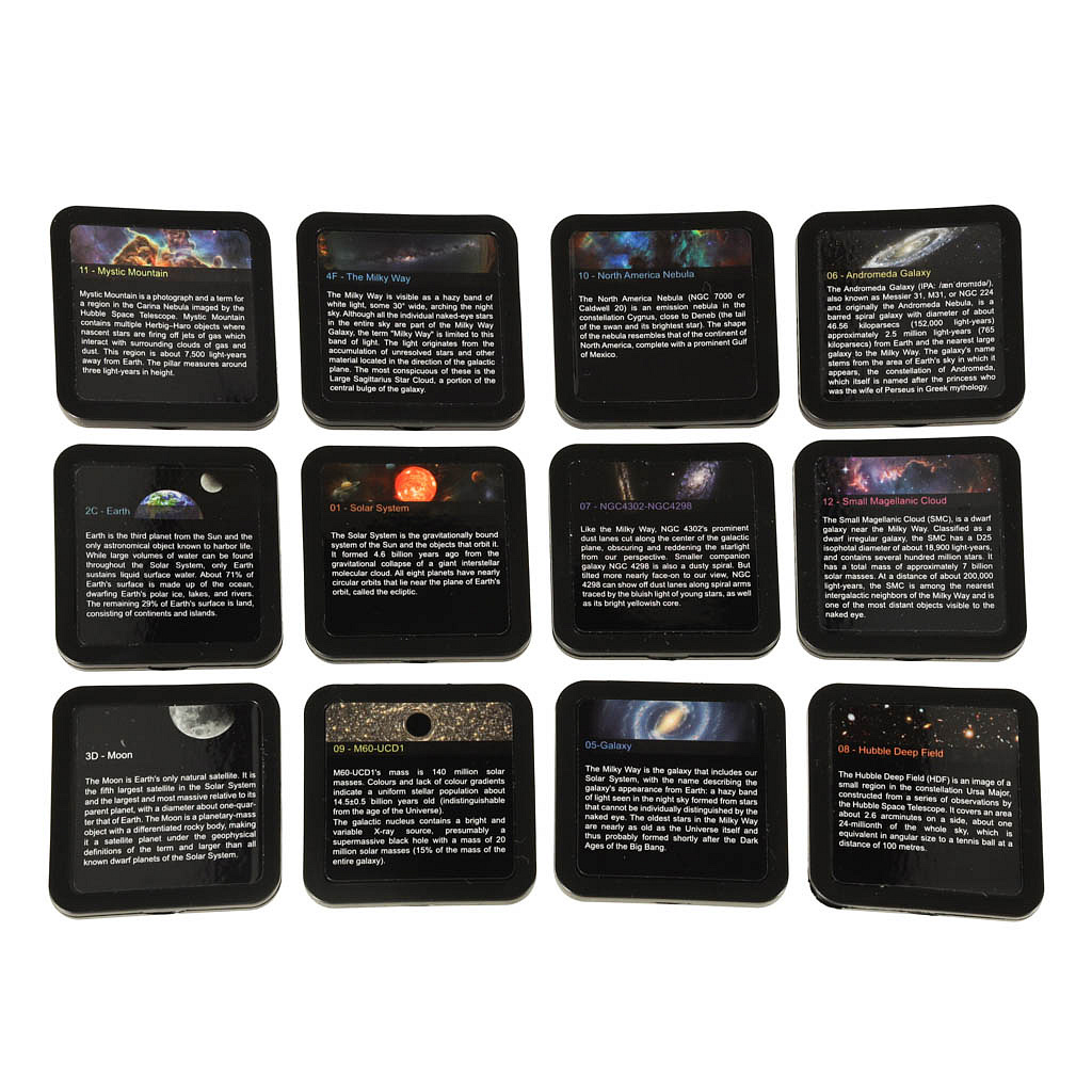 Sada obsahuje 12 disků s různými obrazy, mimo jiné: Země, Sluneční soustava, Mléčná dráha, Měsíc. Každý z disků je popsán a má krátký popis (v angličtině), což umožňuje učení o kosmických objektech.