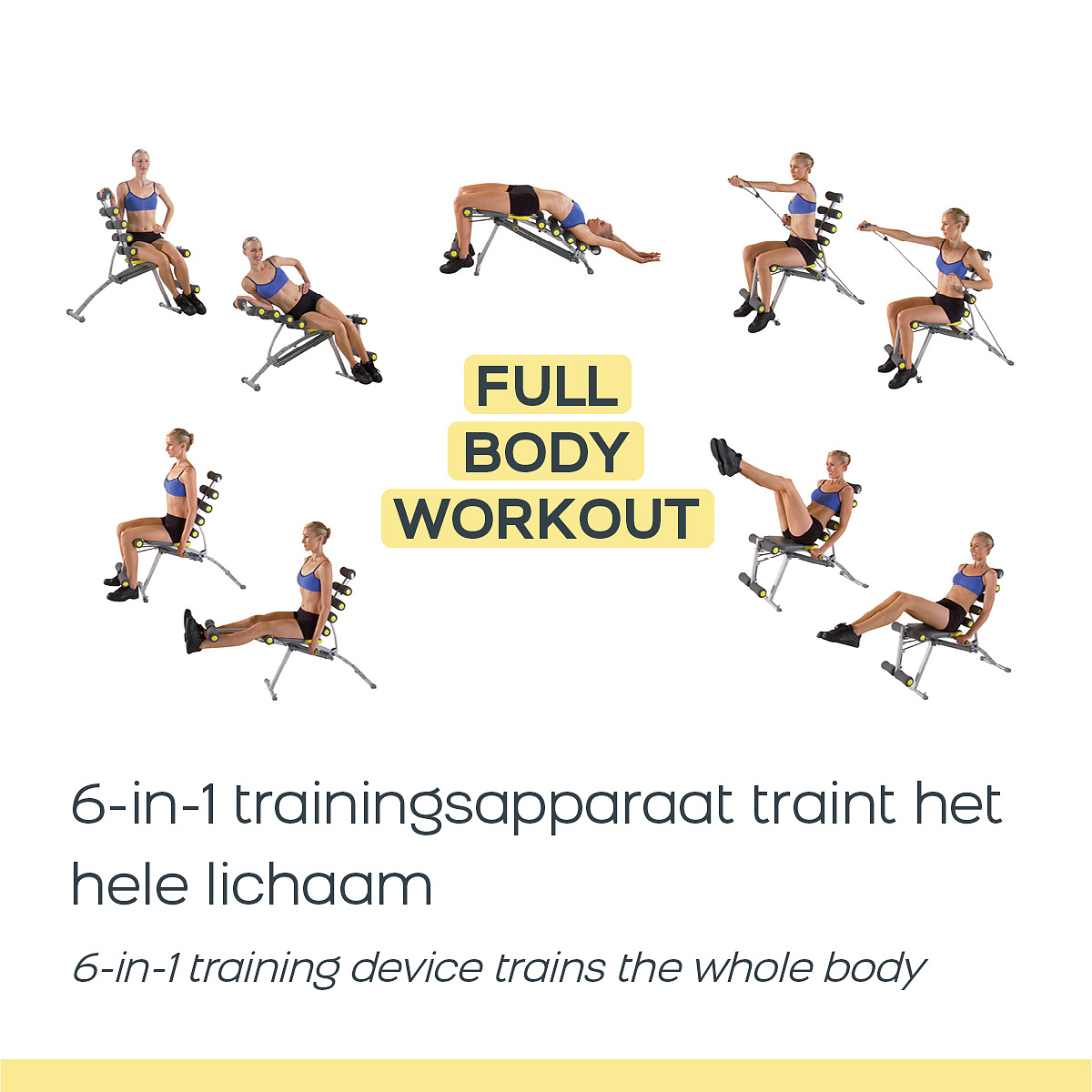 The Rock Gym is a revolutionary 6-in-1 home fitness machine. You can easily perform various exercises with this device to train your entire body. Sit-ups, leg exercises, push-ups, stretching: it's all possible with the Rock Gym!