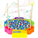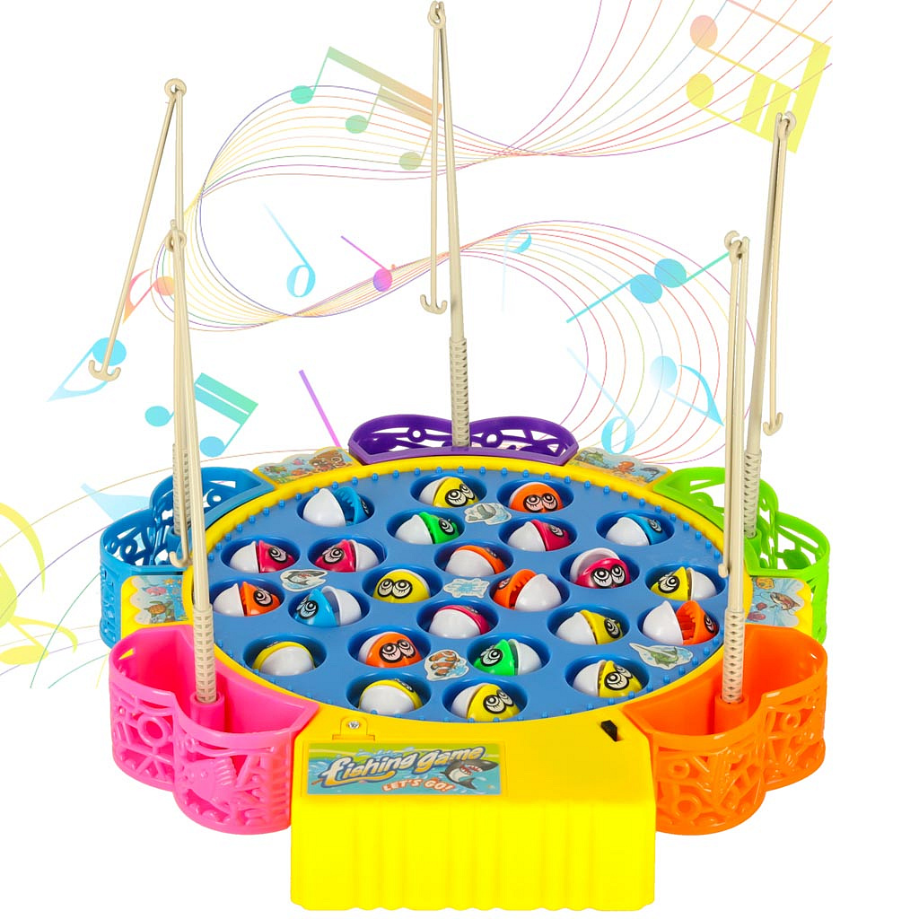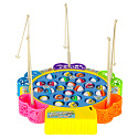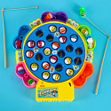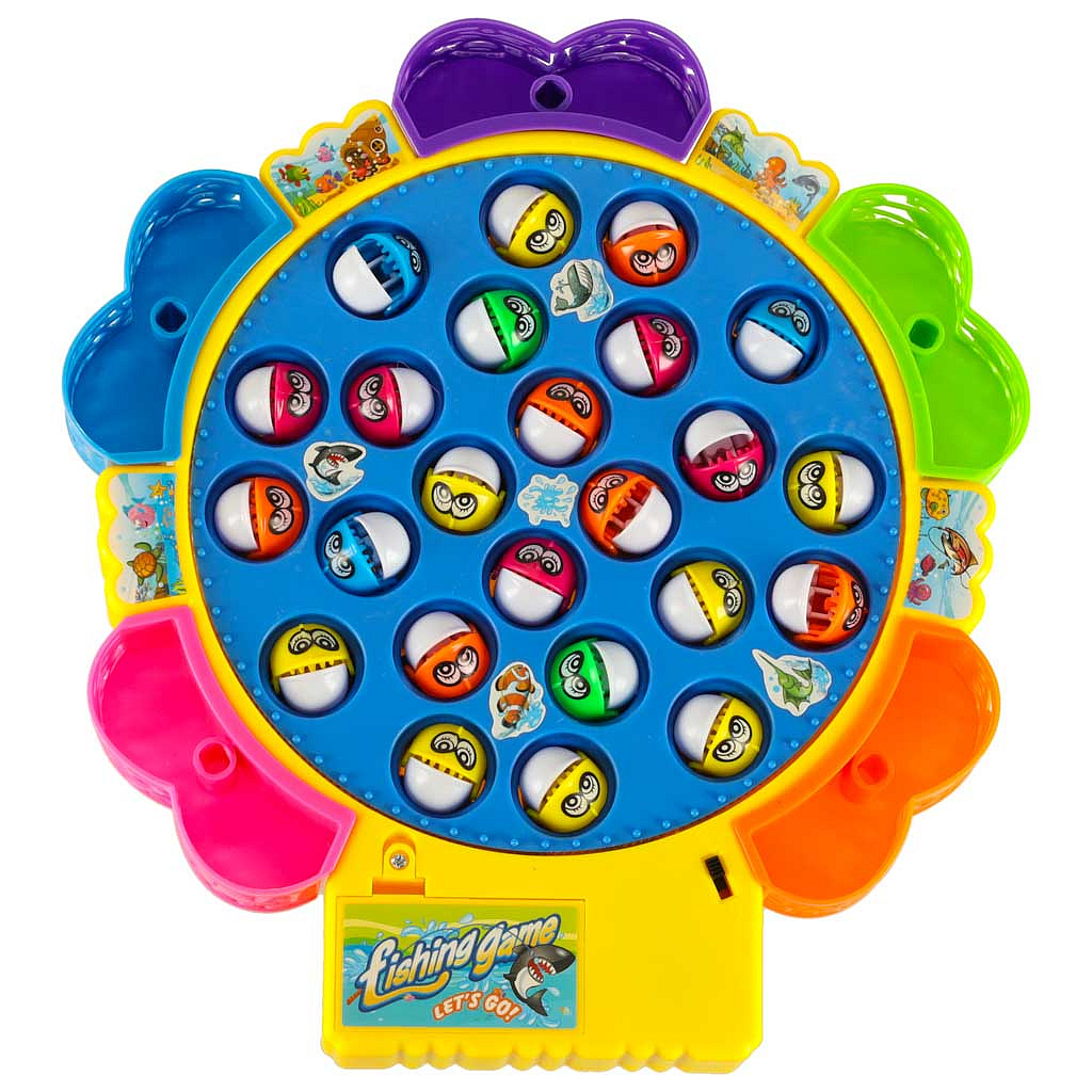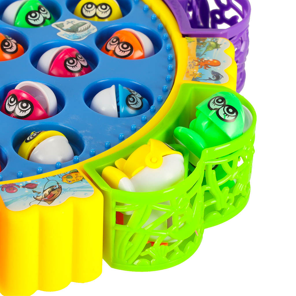 Koło z rybkami kręci się w rytm wesołej muzyki. Kolorowe pojemniczki na złowione rybki są wyjmowane.