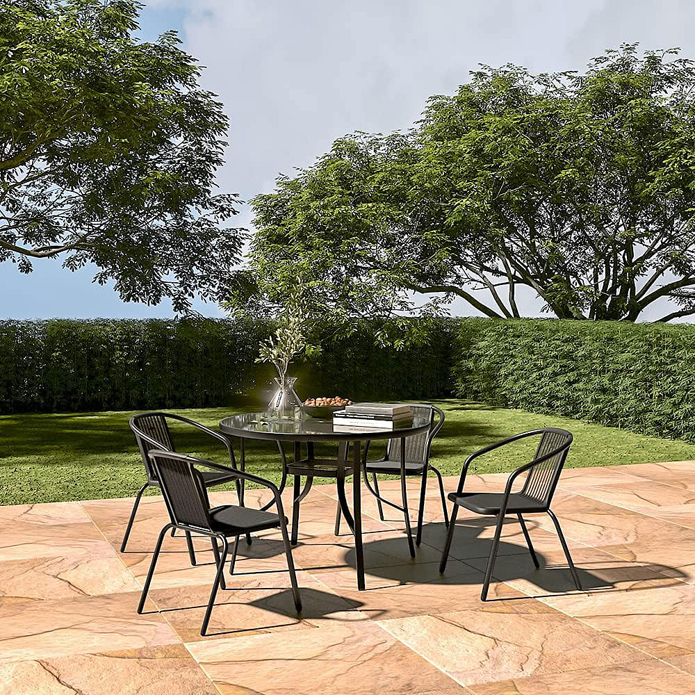 The tabletop is made of tempered "Water Wave" glass. It is resistant to weather conditions and mechanical damage. Thanks to this, you don’t have to worry about accidental impacts from cups or plates. The tabletop is finished with a black frame that additionally protects its edges and gives it a distinctive look.