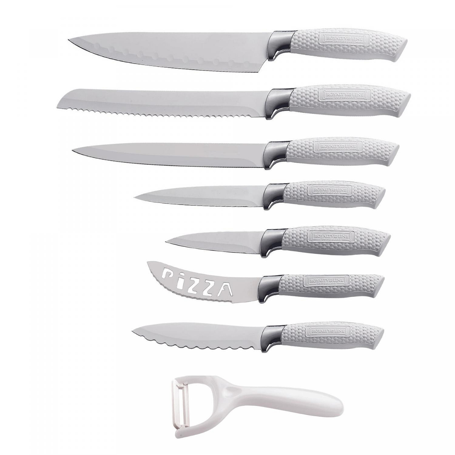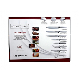 - Všestranná 7dílná sada: Nůž Royalty Line RL-WHT7-W obsahuje kompletní sadu sedmi nožů, včetně nože na maso, kuchařského nože, nože na chléb, dvou univerzálních nožů, nože na pizzu, nože na sýr a loupačky. Tato ucelená kolekce vás vybaví dokonalým nožem pro každé krájení a porcování ve vaší kuchyni.