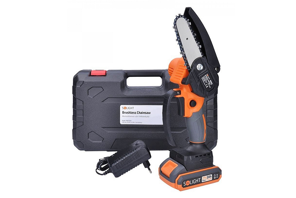 Ruční akumulátorová pila Solight RNP100A1 disponuje lištou o délce 100 mm a řetězem s 56 články a roztečí 6,25 mm. Jeho šířka činí 11 mm. Pohání ho výkonný motor s výkonem 630 W, což zajišťuje řeznou rychlost až 5 m/s.