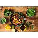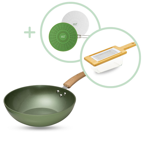 With the 3-piece kitchen set from Just Vegan, you'll create the most delicious dishes on the table. The mandoline effortlessly slices vegetables and fruits with its four different attachments. The ingredients can then be prepared in the wok pan, equipped with a vegetable-based ceramic non-stick coating. For any splatters or intense odors, you can use the splash cover, which is equipped with an AirActive activated carbon filter to neutralize unpleasant smells. Get inspired by the Just Vegan 3-piece kitchen set and discover how easy it is to prepare delicious, healthy meals.