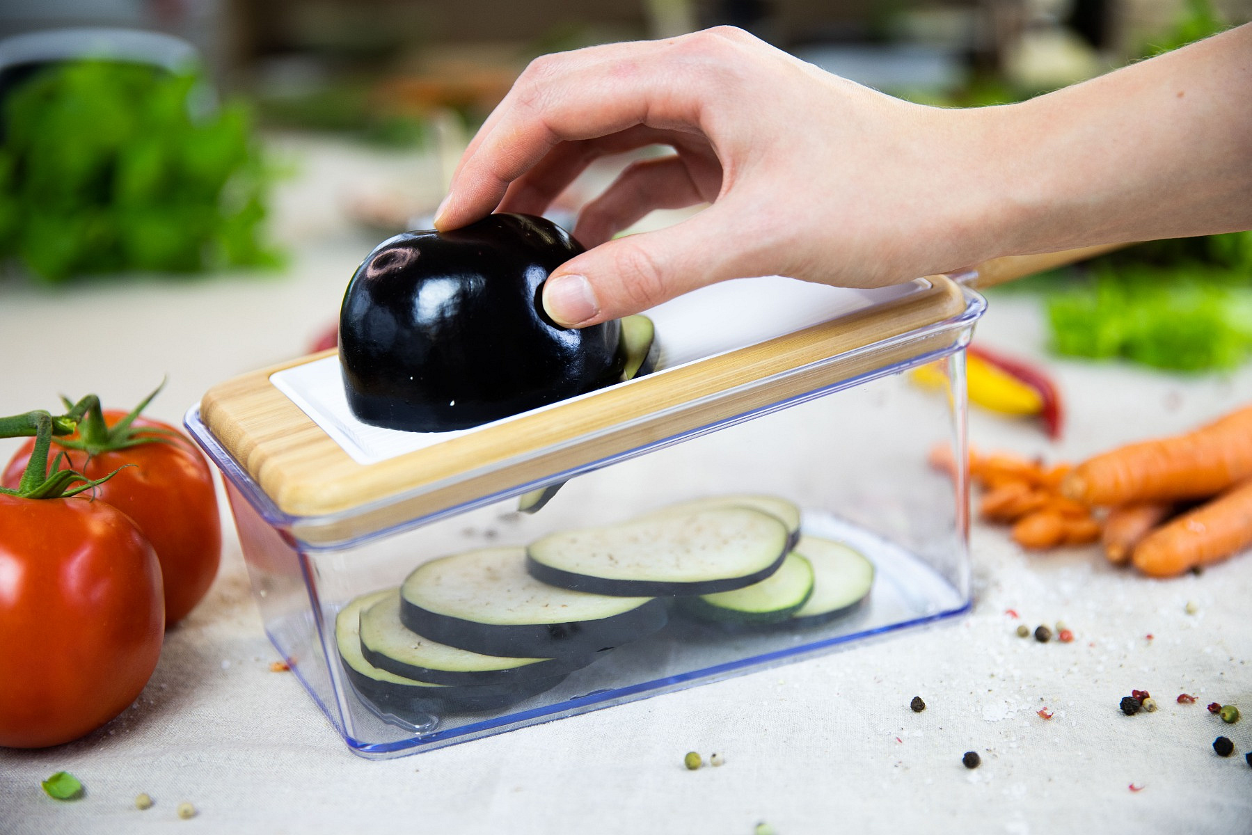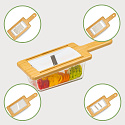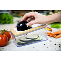 The kitchen slicer features a glass catch container and a slicing cover made of sustainable bamboo. The cover also has a handle for easy grip. This mandoline comes with a handy cutting aid that allows you to press your vegetables or fruits firmly against the cutting blade while protecting your fingers and hands. Moreover, you can use the glass container for stylish food storage, whether in the refrigerator or a kitchen cabinet. The glass container can hold cold or hot, solid or liquid foods.