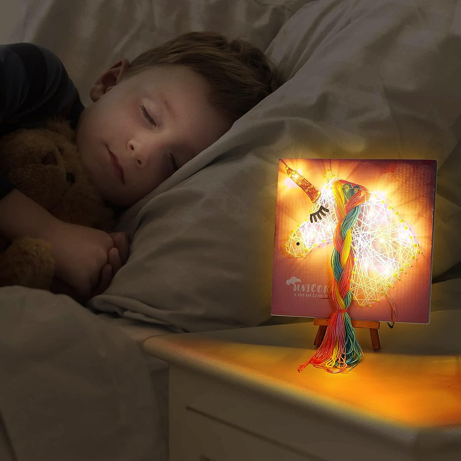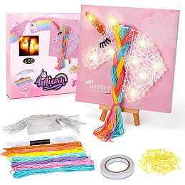 Tato umělecká sada s motivem jednorožce a LED lampičkou umožňuje dětem vytvářet vlastní umělecká díla.