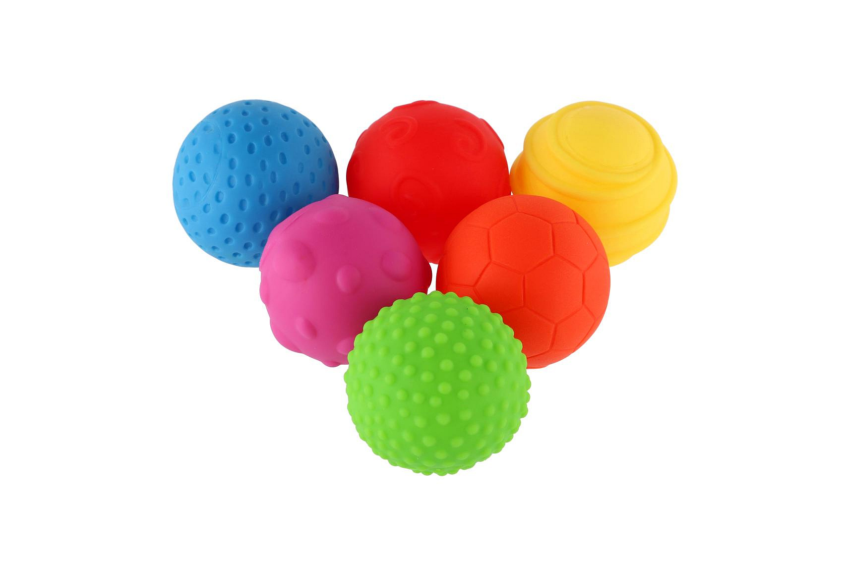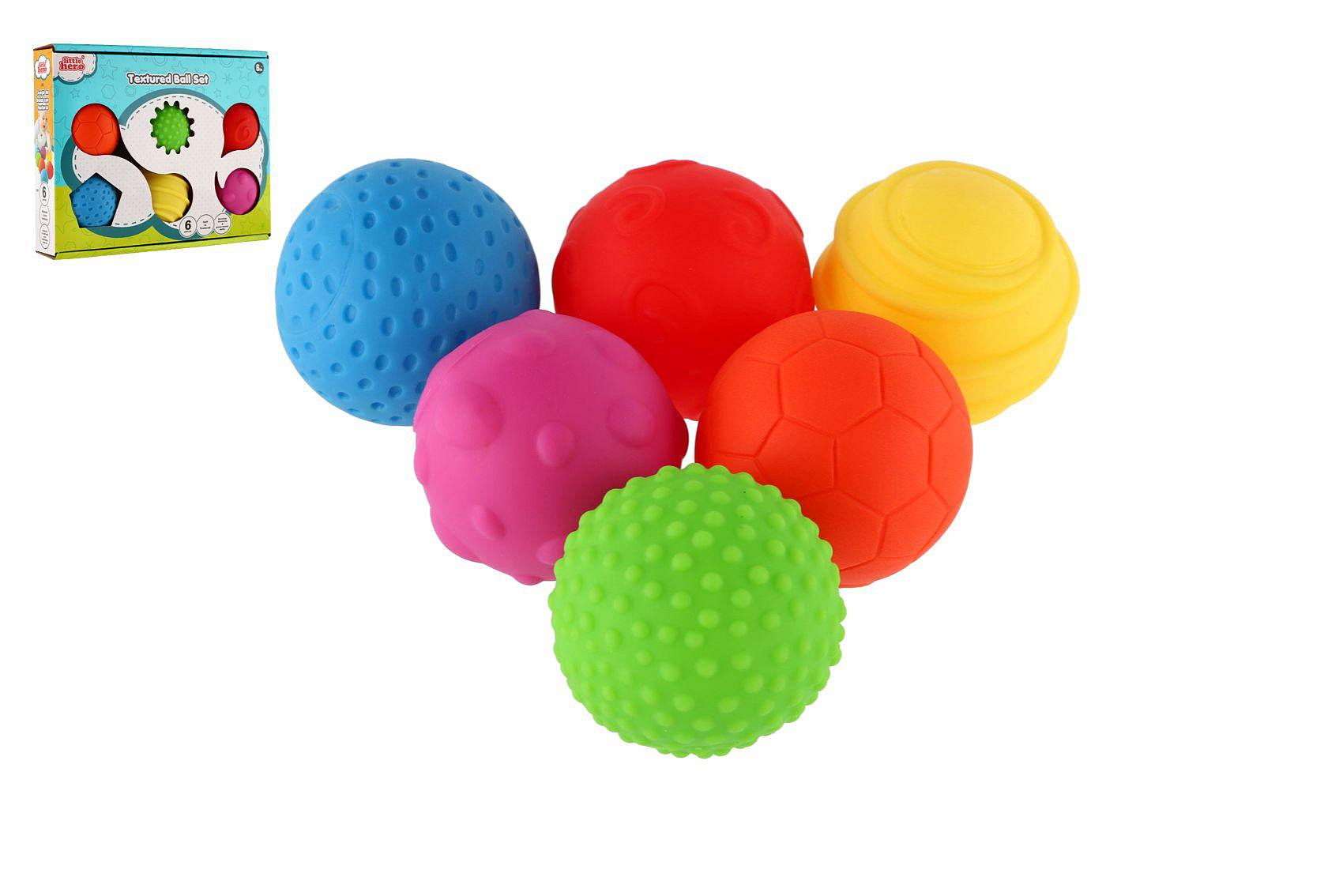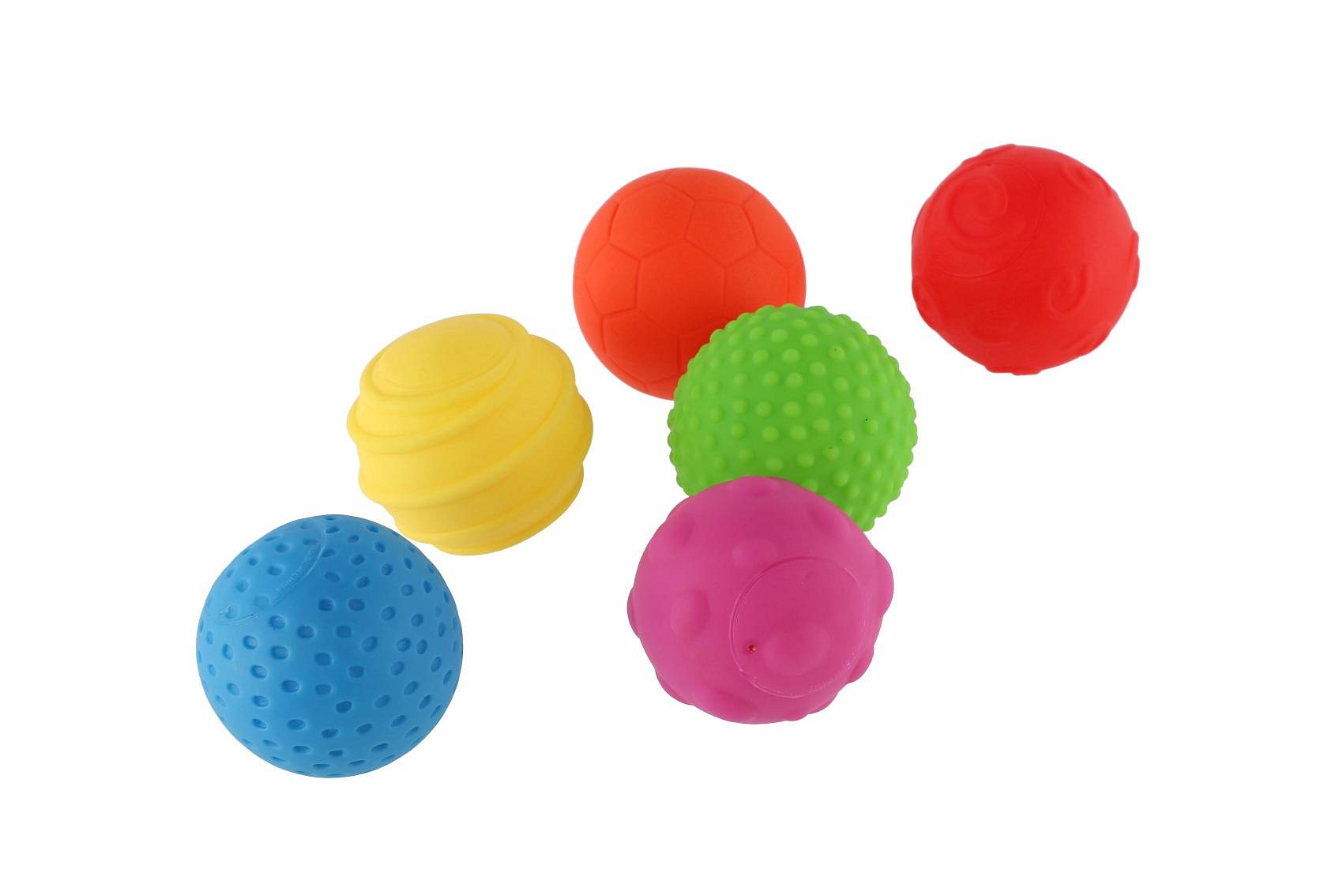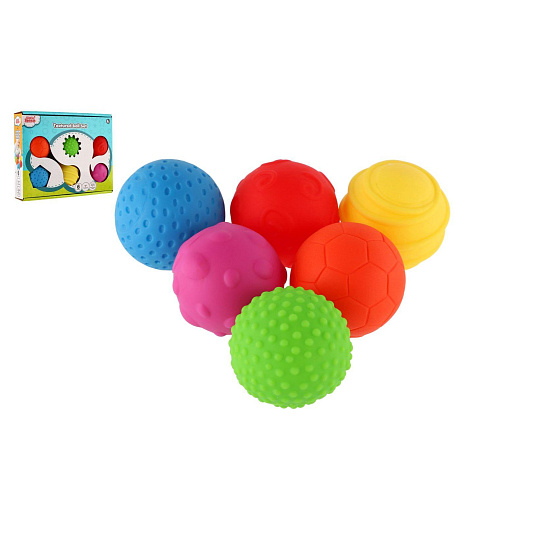 Sada 6 barevných gumových míčků. Každý míček má na svém povrchu jinou texturu. Průměr míčku 6 cm Rozměr krabice: 23 x 18 x 4 cm Vhodné od 6 měsíců