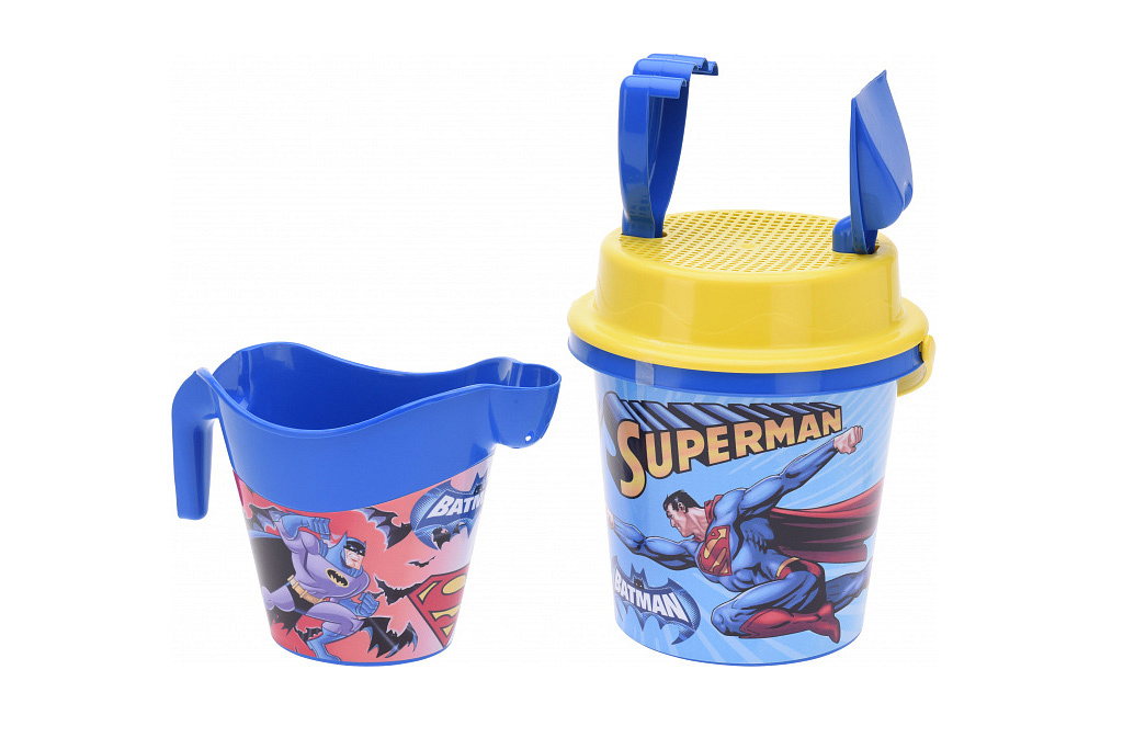 Značková sada na písek SUPERMAN Hrajte si celé hodiny v písku s touto odolnou sadou skládající se z různých hrábí a kbelíků. Postavte si ten největší hrad z písku, jaký jste kdy postavili. Originální sada se Supermanem od DC Comics.