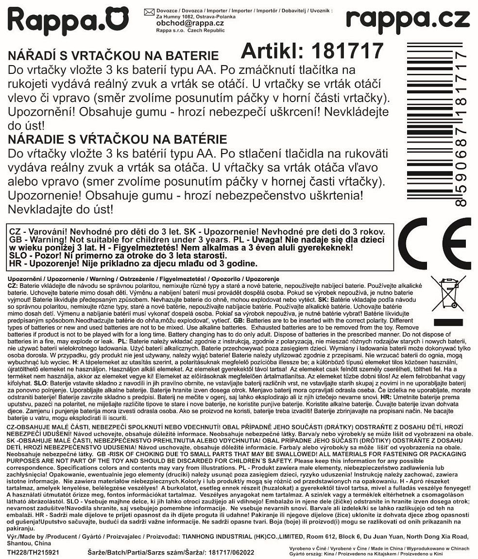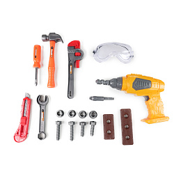 Sada nářadí pro všechny malé kutily! Tento praktický set obsahuje vše, co malý opravář potřebuje, dokonce i parádní funkční vrtačku! Vše je vyrobeno z PVC. Pro funkci vrtačky je nutné vložit 3 ks baterií typu AA, které nejsou součástí. Barvy nářadí se mohou lišit.
