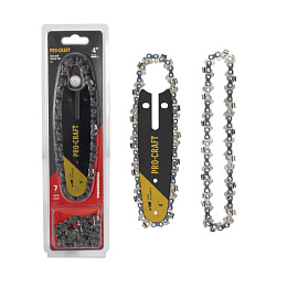 Sada pilových řetězů a lišty Procraft S4 pro řezání dřeva a větví. Obsahuje lištu 4 palce, 2 řetězy, šířka drážky 1.1 mm, rozteč řetězu 1/4 palce. Kompatibilní s modely PKA16 a PKA24.