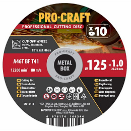 Sada řezných kotoučů Procraft CD125x1.0b. Průměr kotouče: 125 mm, Průměr otvoru: 22,23 mm, Tloušťka 1,0 mm, Balení 10ks.