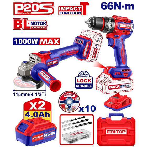 SADA Vrtací šroubovák s příklepem 66Nm a úhlová bruska 115mm AKU 20V 2x4Ah