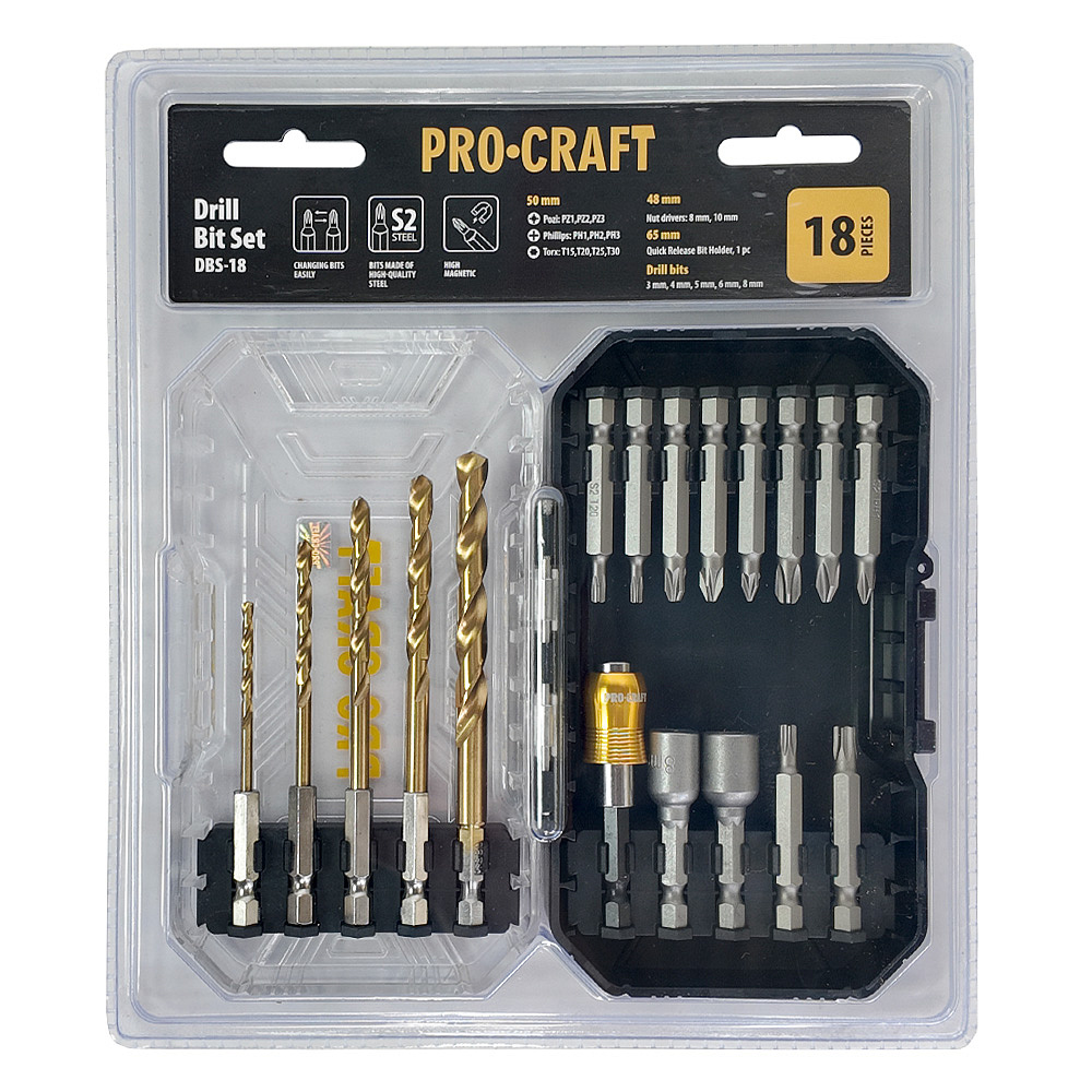 18dílná sada vrtáků a bitů Procraft DBS-18 10 ks 50mm bitů: Phillips: PH1, PH2, PH3, Pozi: PZ1, PZ2, PZ3, Torx: T15, T20, T25, T30 65mm magnetický držák bitů: 1 ks 2 ks 48mm klíče na matice: H8mm, H10mm 5 ks vrtáků do kovu HSS: 3mm, 4mm, 5mm, 6mm, 8mm