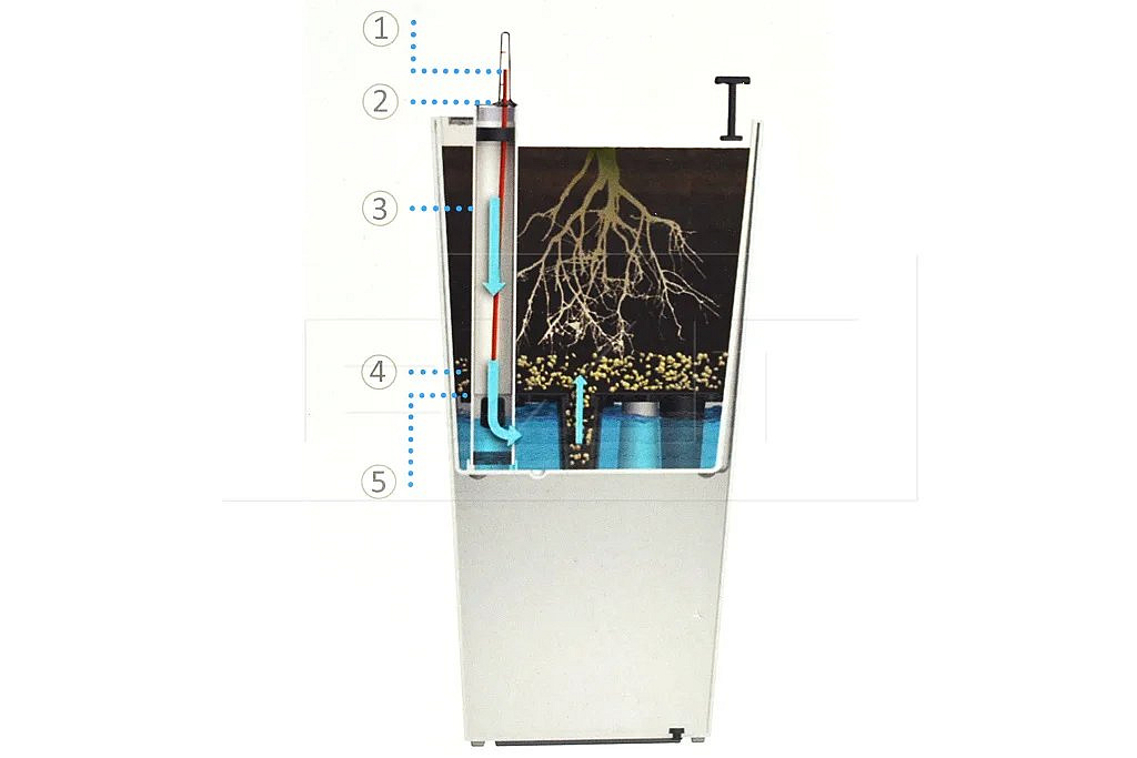Systém obsahuje: průhlednou krytku s nalévacím otvorem ukazatel hladiny vody datumovku trubici