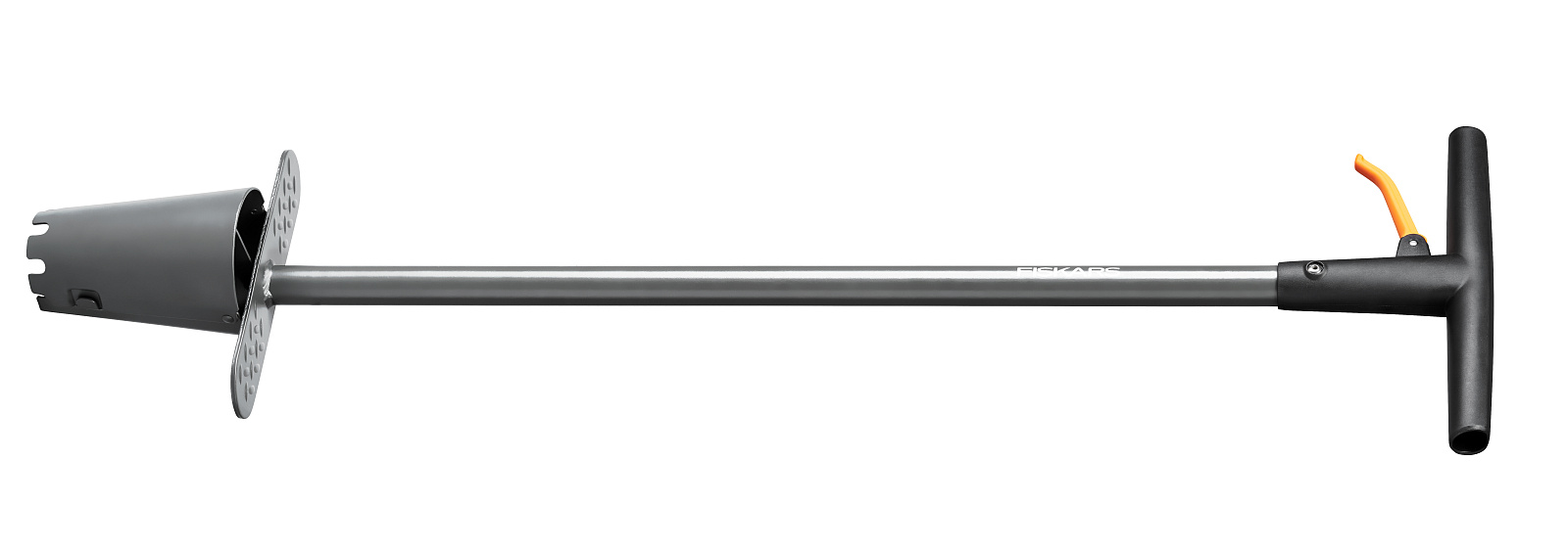 Stiskem oranžové páky na držadle se uvolní zemina z pracovní hlavy pro zasypání cibulky v zemi