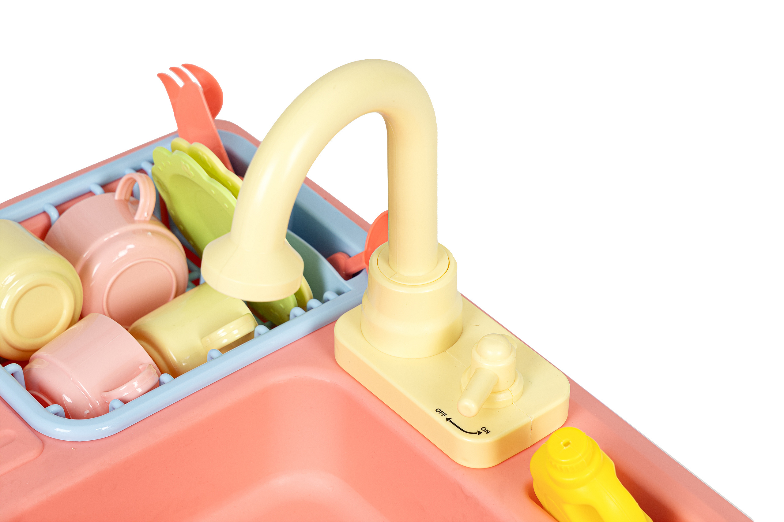 The toy is designed to resemble a real kitchen sink, making play highly engaging. On the right side is a removable dish rack for placing washed plates, cups, and cutlery. Next to the faucet is a special spot for dish soap and a scrubbing brush. Just below the faucet is a small knob that activates the water stream, which flows into the sink basin, drains into the container, and – thanks to the pump – cycles back to the faucet.