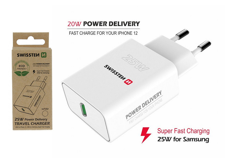 Nabíječka má moderní výstupní port USB-C, který disponuje technologií Power Delivery pro Apple, ale i Super fast charging pro Samsung. Vysoký výstupní výkon 25W.
