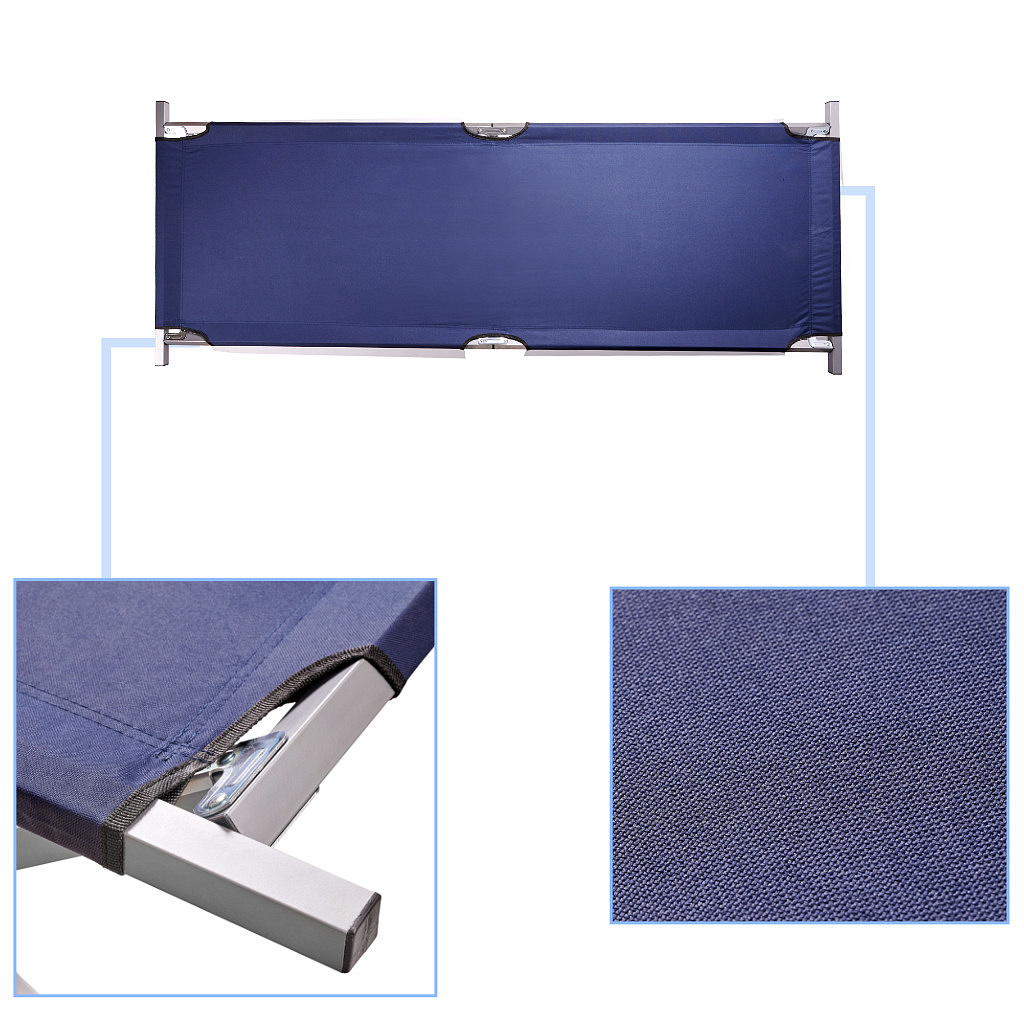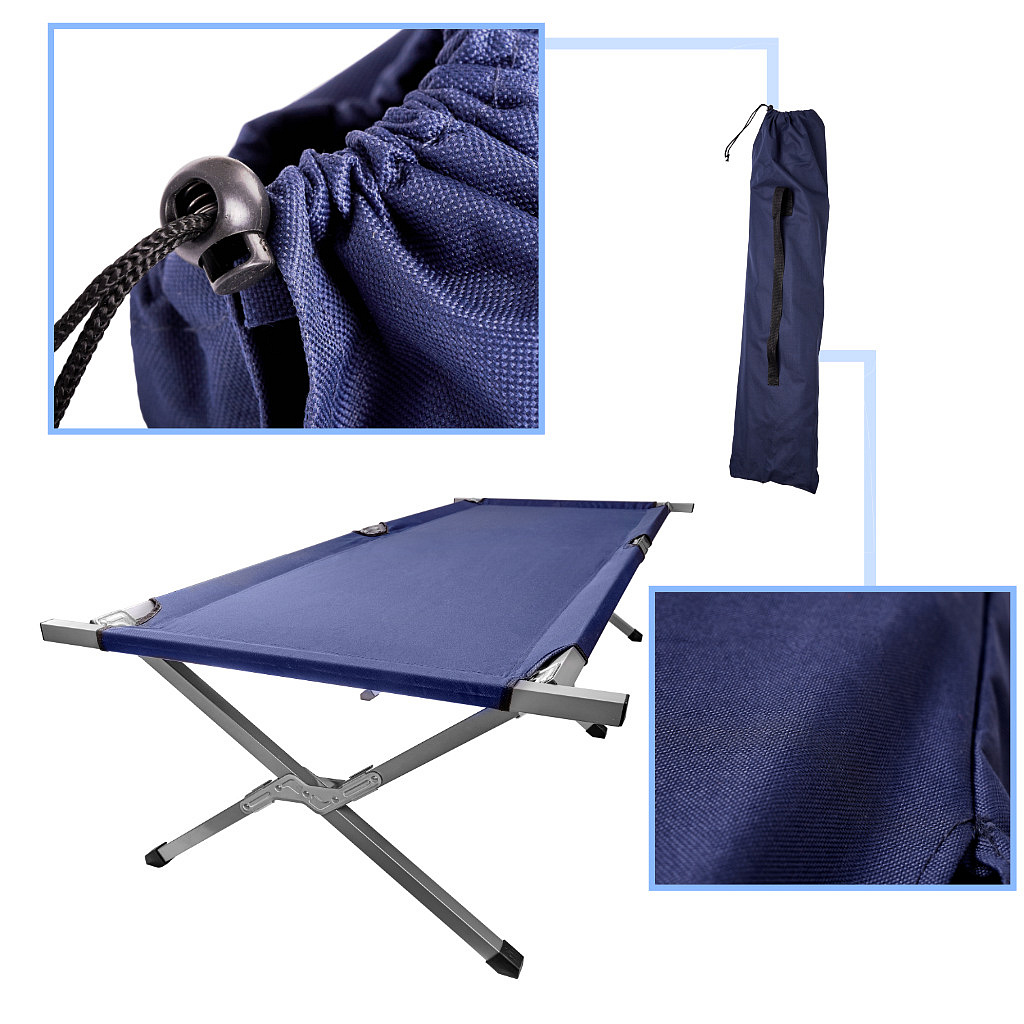 Solidna stalowa konstrukcja zapewnia stabilność, a szerokie poszycie daje wygodę nawet przy dłuższym odpoczynku. Spokojnie utrzyma osobę dorosłą do 150 kg. Łóżko rozkłada się w kilka sekund – bez konieczności użycia dodatkowych narzędzi.