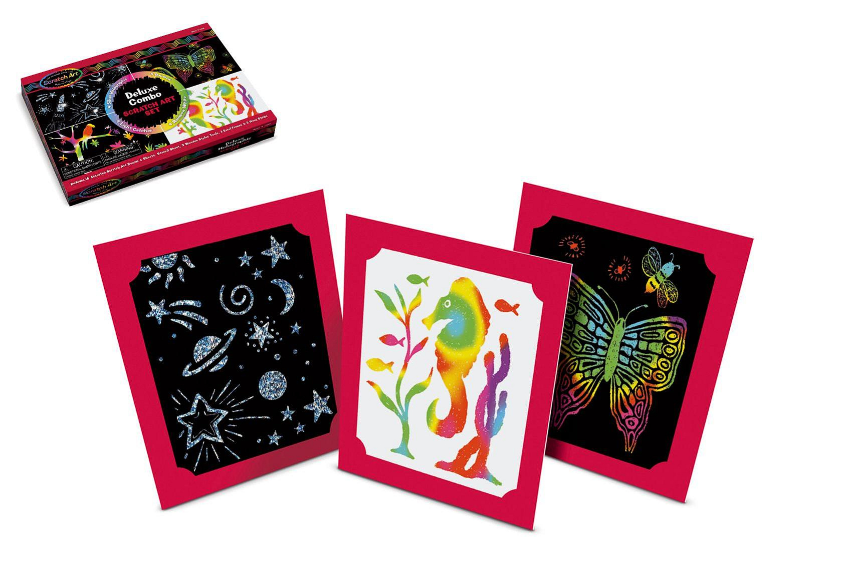 Parádní vyškrabovací sada! Tato sada obsahuje materiál pro 16 různých barevných podkladů pro vytvoření uměleckých výtvorů dětí. Je možné vyškrabávat podle vlastní fantazie nebo podle šablon v sadě. Velikost obrázků: 14 x 21, 5 cm Rozměr balení: 35 x 25 x 4 cm Vhodné pro děti od 4 let