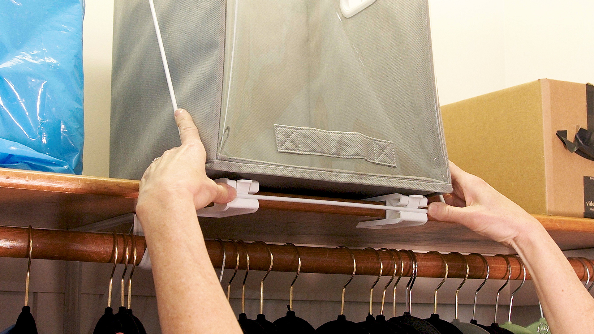Top shelf access will never be a problem again thanks to the revolutionary Closet Caddy storage box with lifting bar system. It is a fold-down shelf storage system that allows you to retrieve items from high shelves for safe and easy storage. It is no longer necessary to climb a wobbly chair, ladder or stool to get to your belongings. By pulling the handle, the Closet Caddy can be easily removed from the shelf. When you're done, you can easily put it back with the same handle.