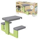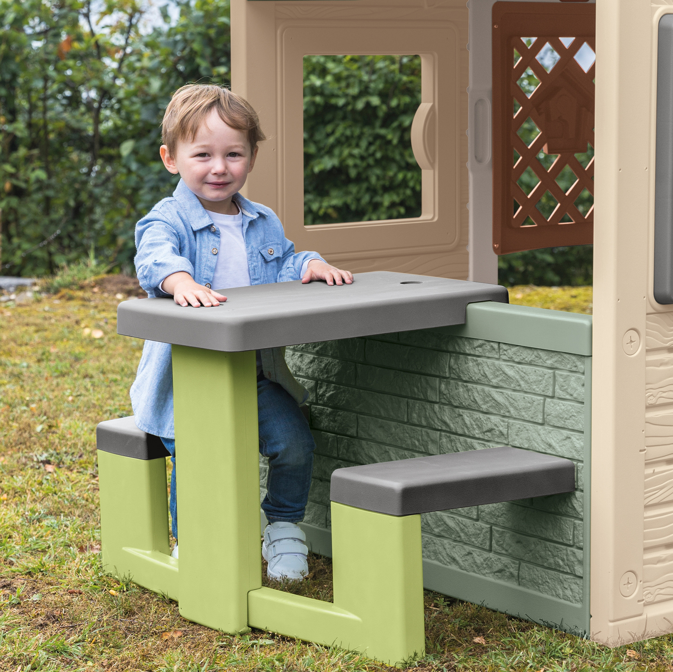 Smoby Stolik Piknikowy to doskonały sposób na wzbogacenie domku ogrodowego i stworzenie dodatkowej przestrzeni do zabawy. Dzięki niemu dzieci będą mogły zorganizować piknik, zjeść przekąskę z przyjaciółmi, a także naśladować dorosłych podczas przygotowywania posiłków, co rozwija ich wyobraźnię i umiejętności społeczne. Produkt jest wykonany z wytrzymałego tworzywa sztucznego, co zapewnia łatwość w utrzymaniu czystości. Dzięki powłoce ANTI-UV, stolik i ławki zachowują swoje intensywne kolory przez długi czas, nawet pod wpływem promieni słonecznych. Stonowane, naturalne barwy doskonale pasują do domków ogrodowych Smoby.