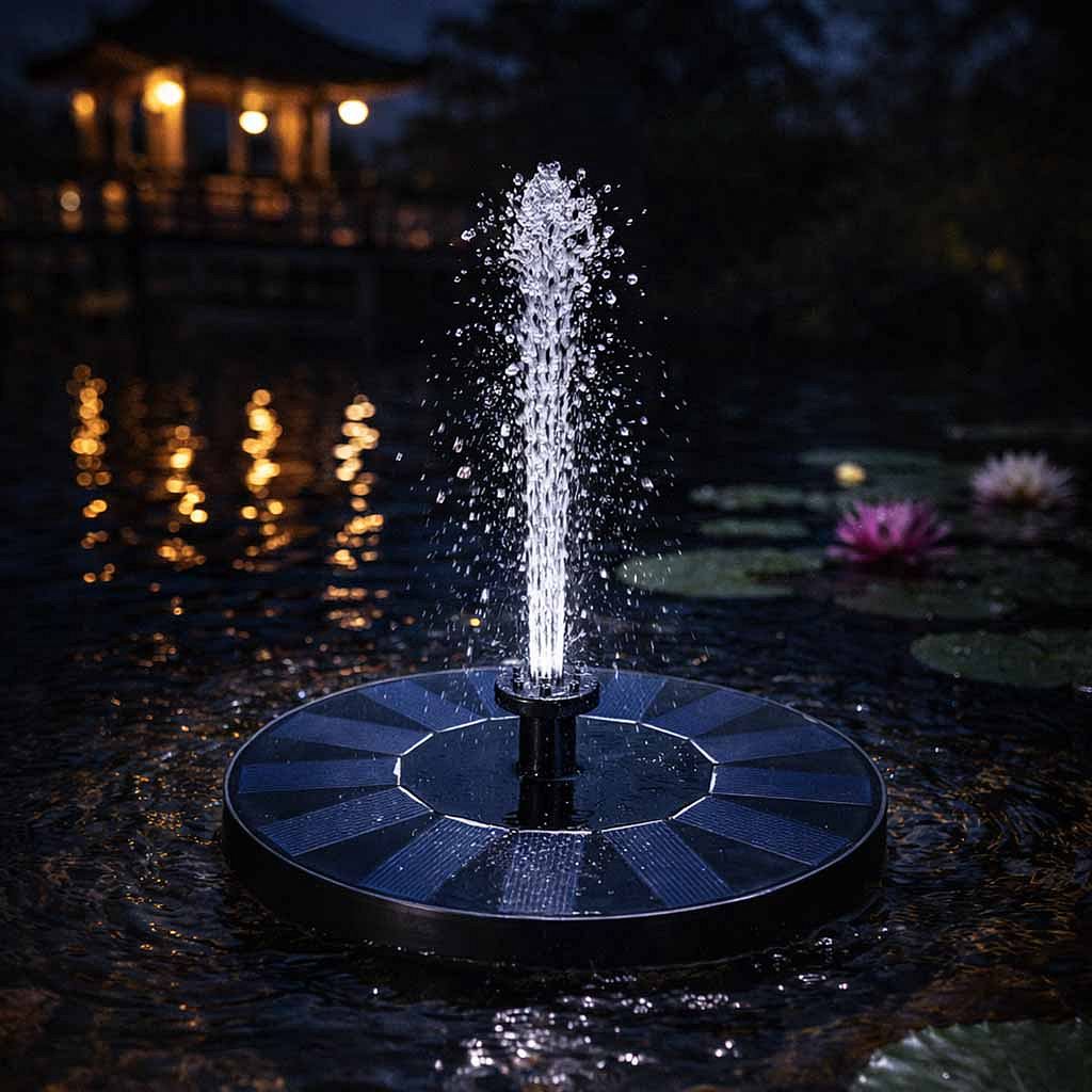 Solární zahradní fontána jistě ozdobí vaši zahradu nebo jezírko. Fontána může být umístěna stabilně v nádrži pomocí přísavek nebo volně plout na vodě. Stačí ji umístit na dobře osvětlené místo, aby úspěšně plnila svůj úkol.