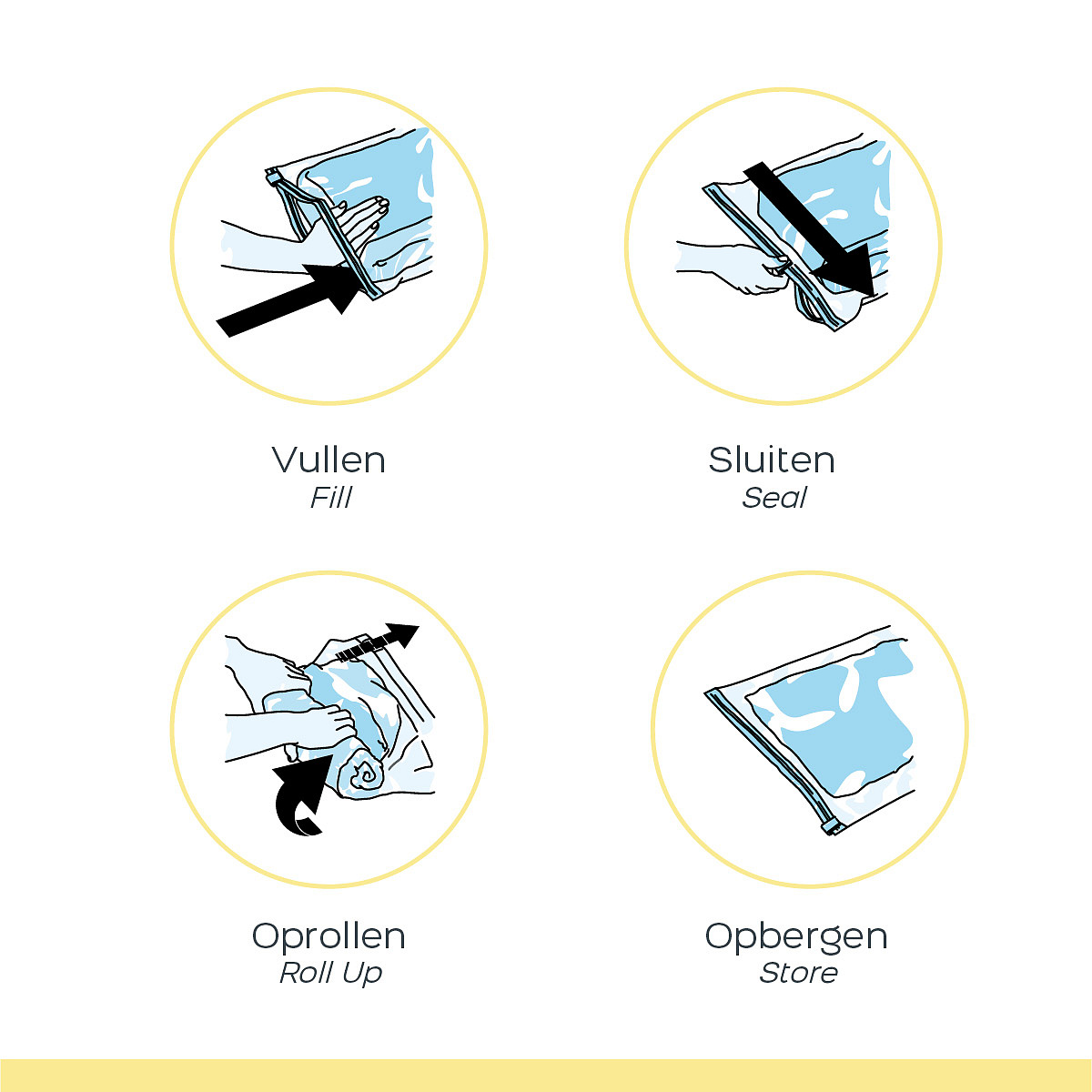 Tyto tašky jsou obzvláště užitečné na dovolenou, protože šetří místo ve vašem příručním zavazadle, cestovní tašce nebo kufru. Průhledný design tašek vám umožňuje rychle identifikovat obsah, což usnadňuje nalezení a vyjmutí konkrétních položek bez nutnosti rozsáhlého hledání nebo vybalování. Navíc vzduchotěsné uzavření chrání vaše věci před prachem, změnou barvy, plísní, vlhkostí, hmyzem a nepříjemnými pachy, což je udržuje déle čerstvé a čisté.Sada obsahuje čtyři úložné pytle různých velikostí, ideální pro oblečení na dovolenou. Tímto způsobem už nikdy nebudete mít nedostatek místa a můžete si také vzít s sebou ty pěkné kalhoty nebo ty hezké šaty. Tašky jsou také znovupoužitelné, což z nich činí ekologickou volbu. Navíc je používání vakuových úložných pytlů Space Buddy velmi snadné. Umístěte své věci dovnitř, zavřete uzávěr a srolujte vak, abyste odstranili přebytečný vzduch. Úložný vak komprimuje a ušetří až 3x více úložného prostoru.