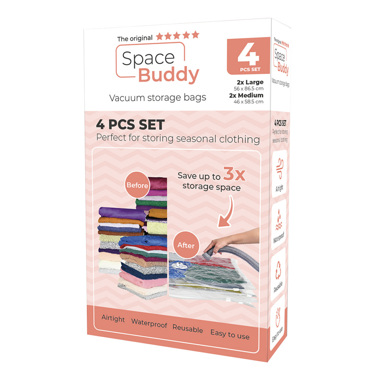 The set includes four storage bags of different sizes, ideal for storing winter and summer clothes. The bags are also reusable, making them an environmentally friendly choice. In addition, using the Space Buddy Vacuum Storage Bags is super easy. Place your items inside, close the closure and use the vacuum cleaner nozzle to suck the air out through the valve or roll up the bag to remove the excess air. The storage bag compresses and saves up to 3x the storage space.