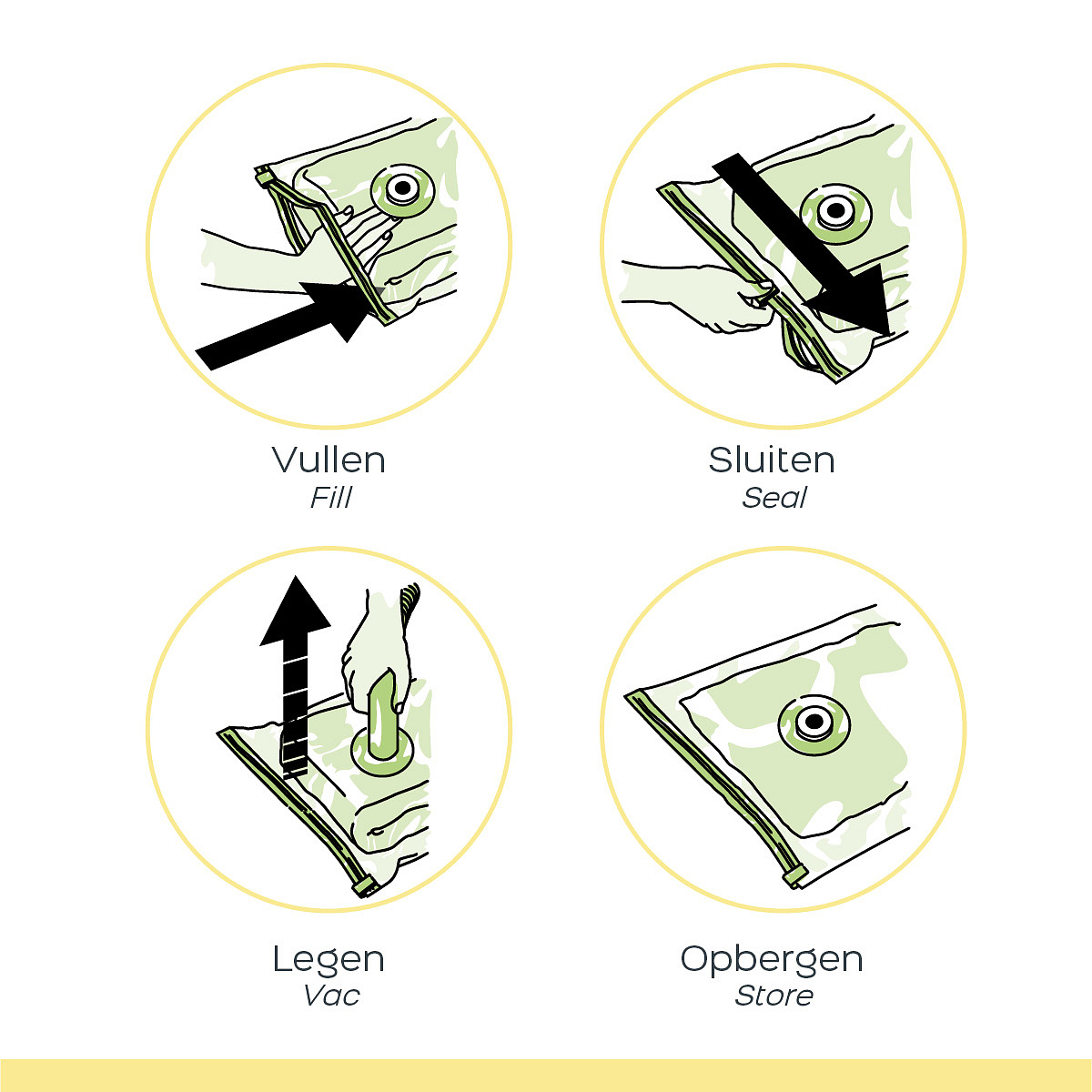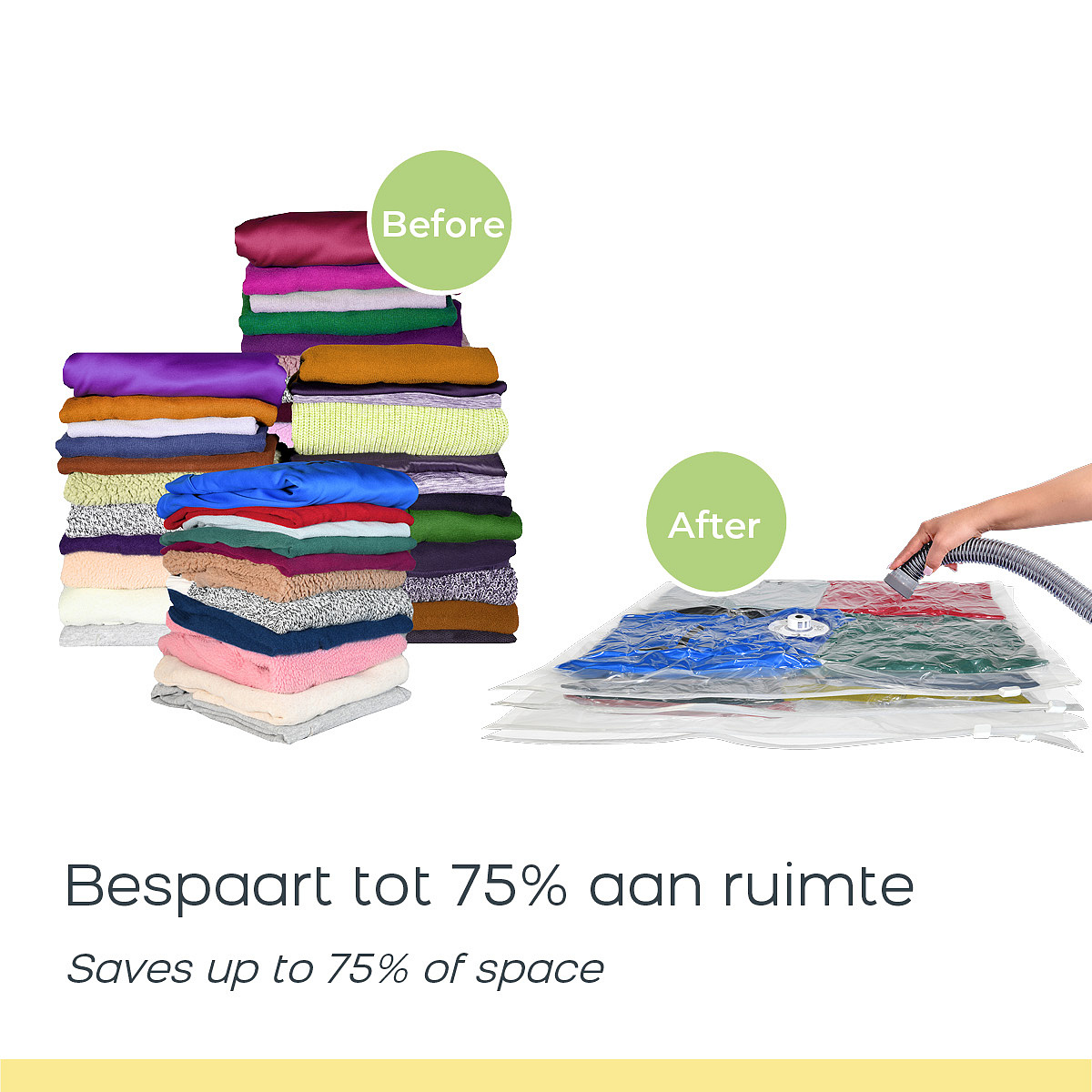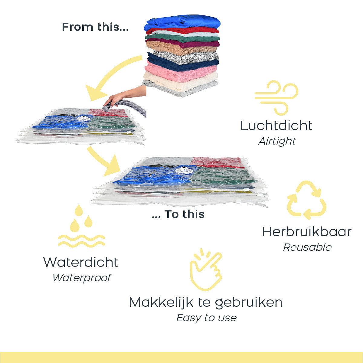 With the vacuum storage bags you can easily store different items. These bags are especially useful for seasonal items that you only need occasionally, so you can create more space in your cupboards, drawers or storage areas under the bed. The transparent design of the bags allows you to quickly identify the contents, making it easy to locate and retrieve specific items without extensive searching or unpacking. In addition, the airtight seal protects your belongings from dust, discoloration, mould, moisture, insects and unpleasant odors, keeping them fresh and clean for a longer period of time.