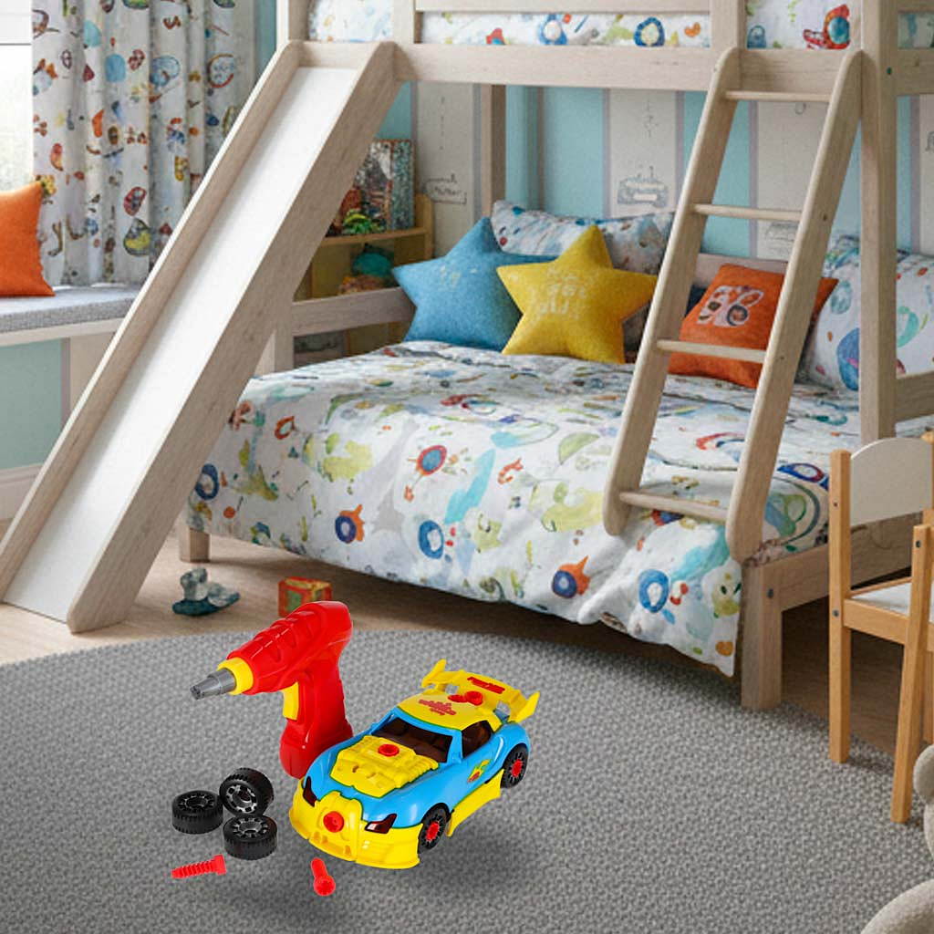 Obsahuje hračkářskou vrtačku – díky ní lze bez problémů odšroubovat části auta nebo vyměnit kola
