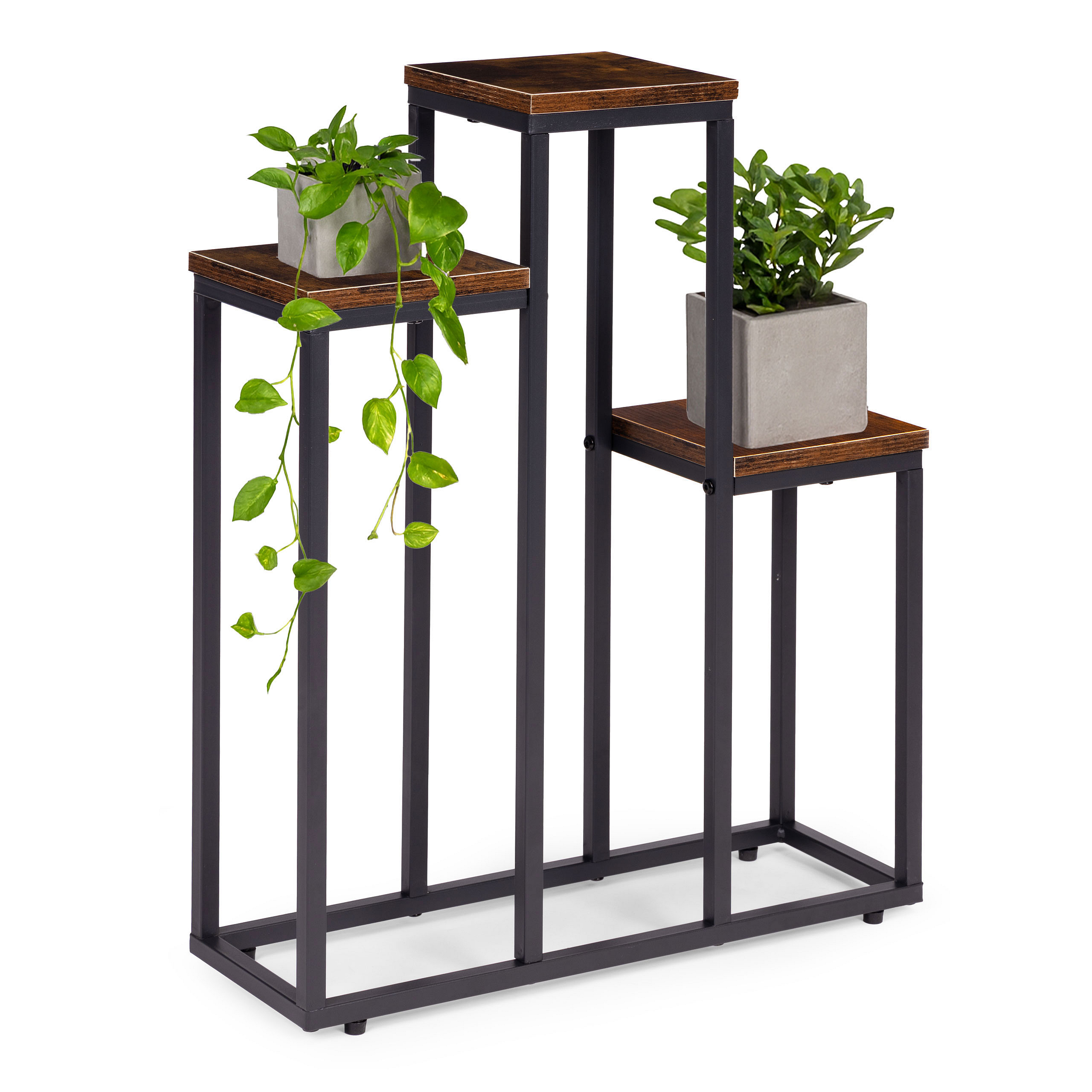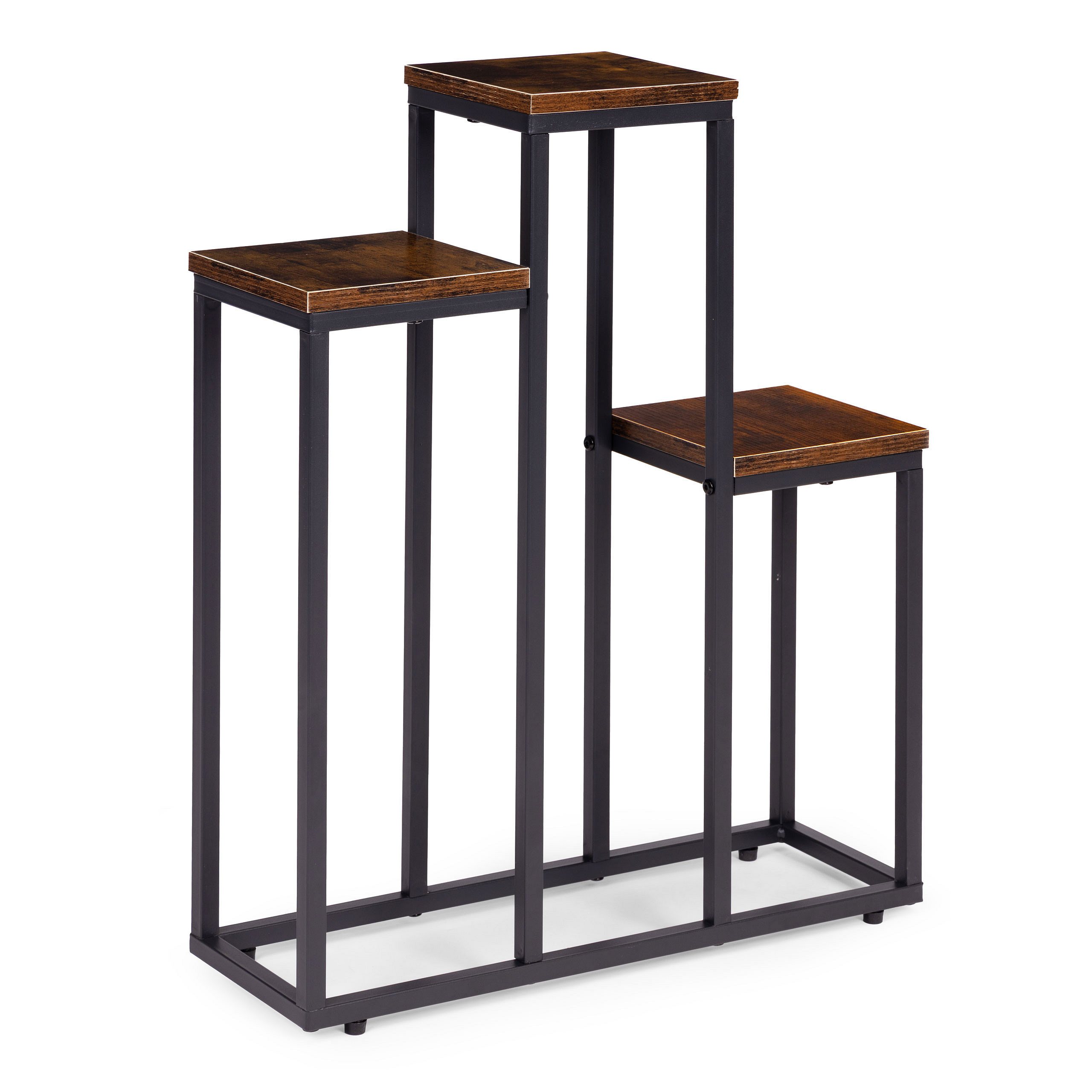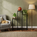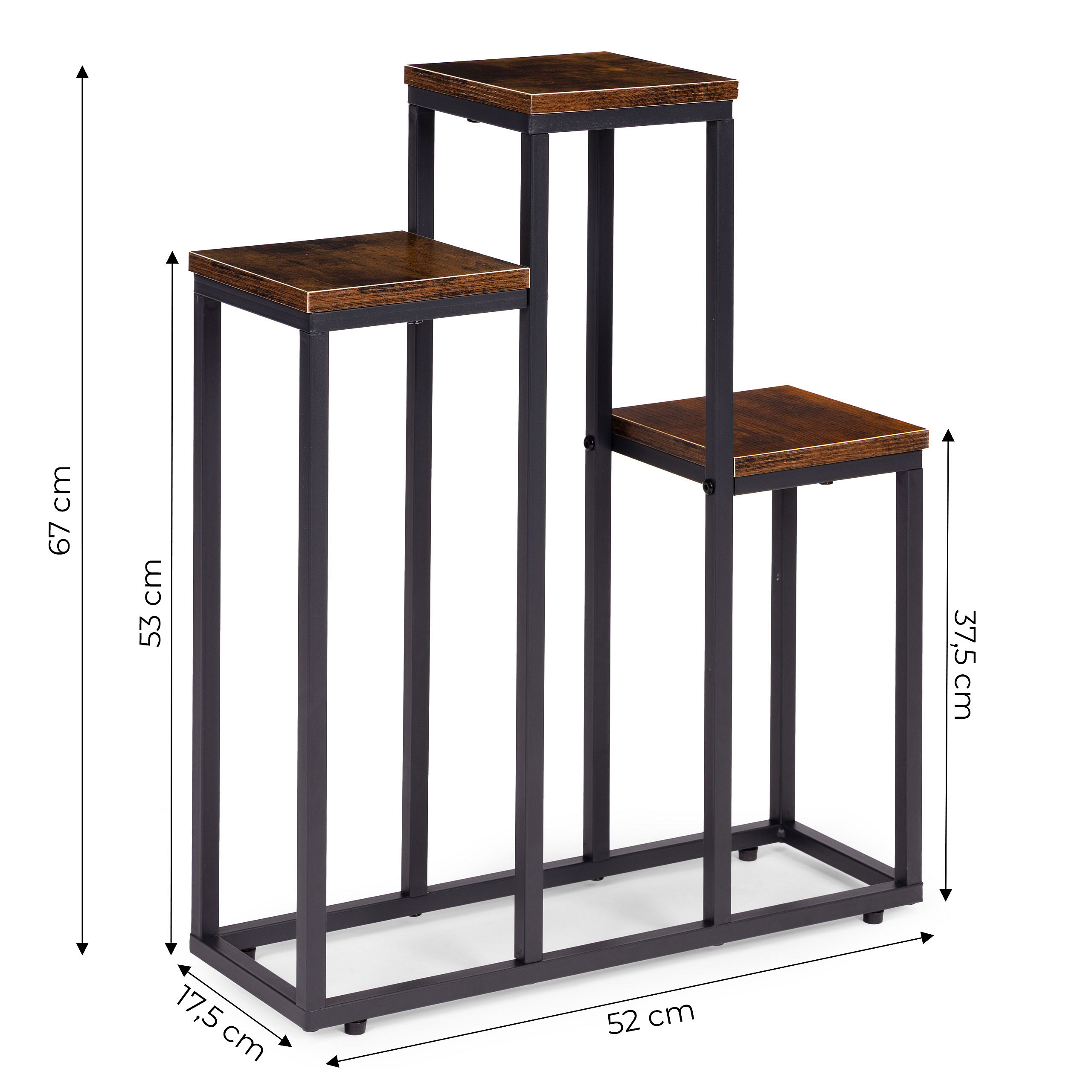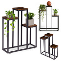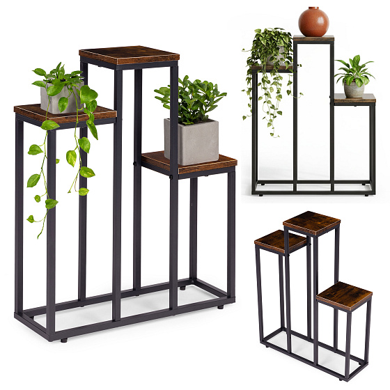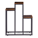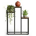 The plant stand is made of powder-coated steel, providing resistance to corrosion and mechanical damage. The chipboard shelves are finished in a natural wood imitation color, emphasizing the decorative, loft-style character of the furniture.