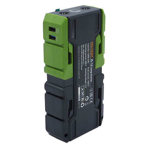 Startovací zdroj s funkcí powerbanky Procraft JS-12NE USB-C nabíjení Výstupní proud 5V/2А Kapacita 12000 mAh Startovací proud (А) 600 Špičkový proud (А) 1200 Max. zdvihový objem motoru (cm3) 8000 Nabíjecí napětí /Proud 5 V / 3А Hmotnost (kg) 1